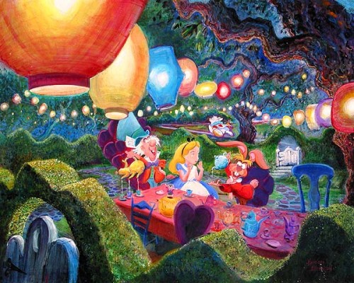 Tre commensali che ruotano attorno a un tavolo in cerca di tazzine e tè e biscottini come i quaternioni di William Rowam Hamilton, ma l’ultimo ospite, il tempo, è assente, e il moto si perpetua. Il cappellaio Matto e il Leprotto Bisestile continuano a cavitare nell’atemporalità, a impannarsi nelle pieghe dell’incommutabilità, della reductio ad absurdum, del nonsense e dell’humour britannico.