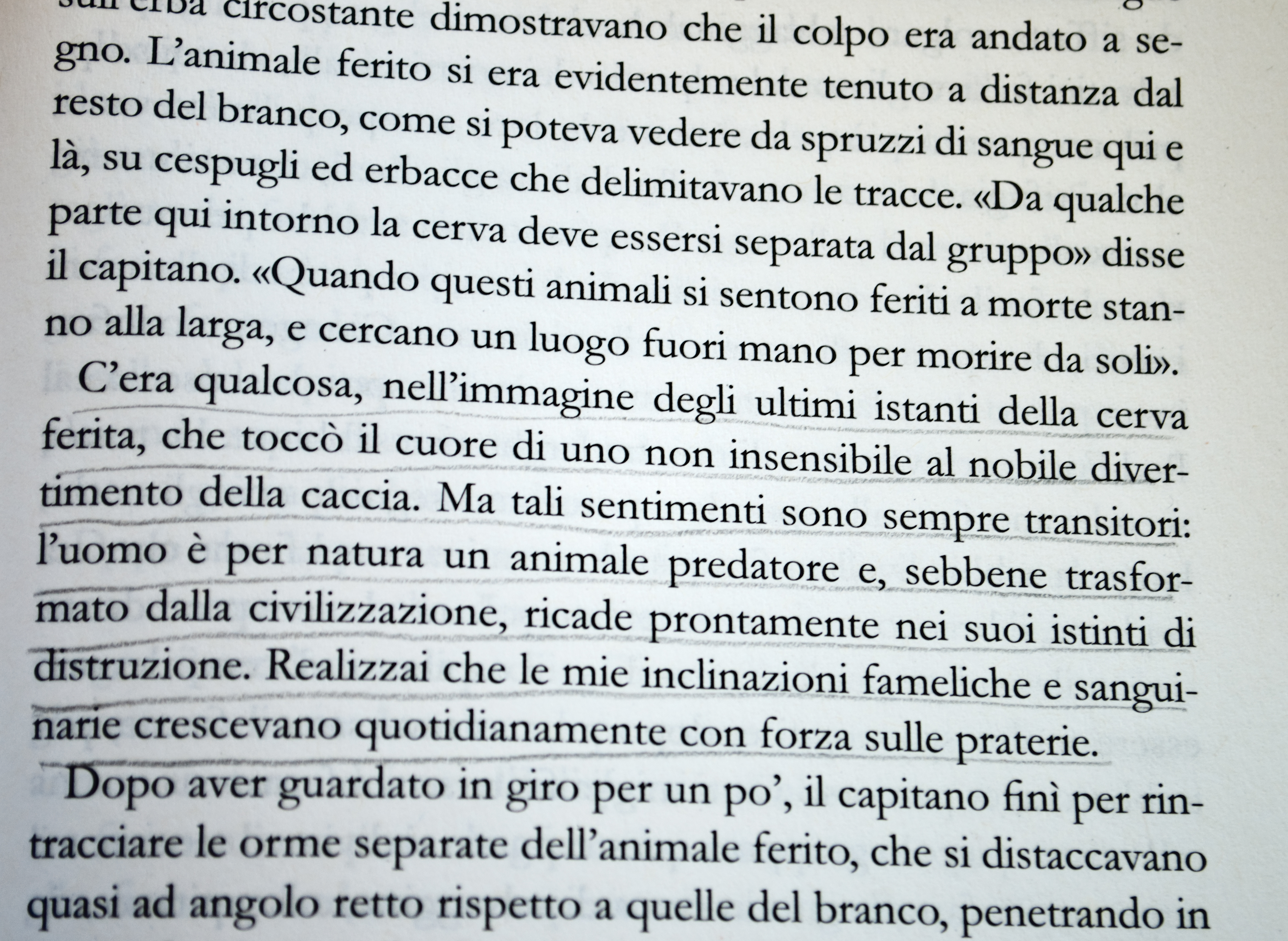 Ma la lettura è stata lenta, bradipica, sofferta. Non per lo stile di Irving, che è molto frizzante, quasi salgariano. Ma -be’, sì- perchè è un libro che prima delle praterie, prima del cielo, prima dei cavalli, parla della “nobile arte della caccia”.
