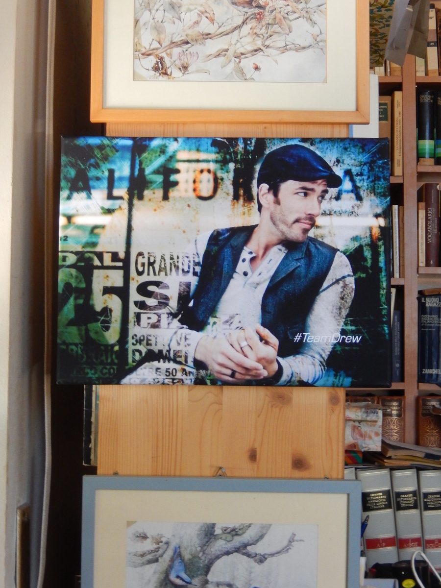 Sia come sia, ho appeso la tela per fotografarla, ma ormai mi sono affezionata. Ho spostato una stampa di un disegno di Beatrix Potter (diavolo, mi è diaspiaciuto), ma per ora voglio tenermi Drew Scott al risveglio.