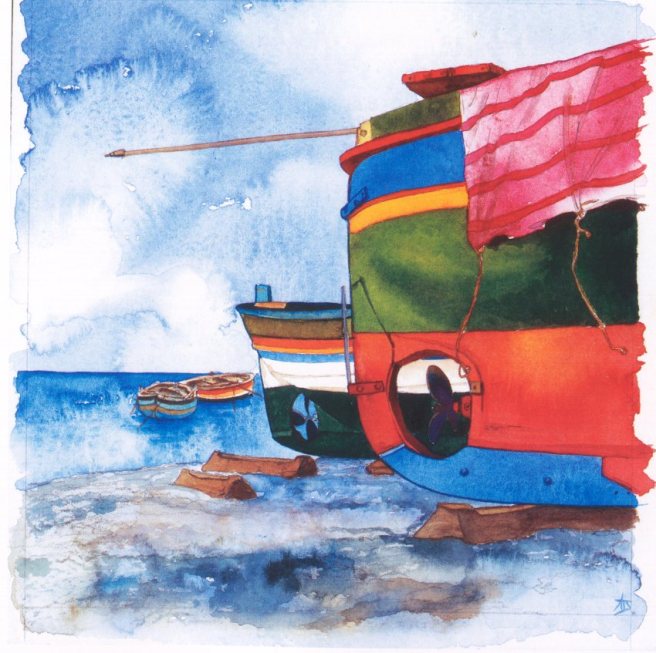 Barche in riposo -acquerello al miele su carta Moulin de Roy