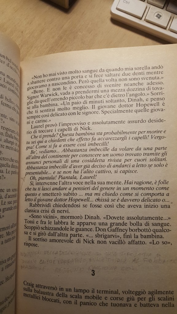 Non è che ci sarebbe molto da considerare: Laurel Stevenson è la tipica personaggia di sponda, che viene sempre vista attraverso l’occhio maschile. Se Dinah, la bimba cieca, appare come il carattere femminile più rilevante, e perfino la quasi-comparsa, Bethany, ha maggiore autonomia descrittiva, Laurel rimane pescelessa dal primo all’ultimo momento. Percepita dapprima attraverso le sensazioni di Dinah, e immediatamente dopo da quelle di Nick e Brian (i due protagonisti del racconto), racconta sé stessa poche volte, e solo riguardo alla sua scarsissima attività sessuale. Grazie mille.