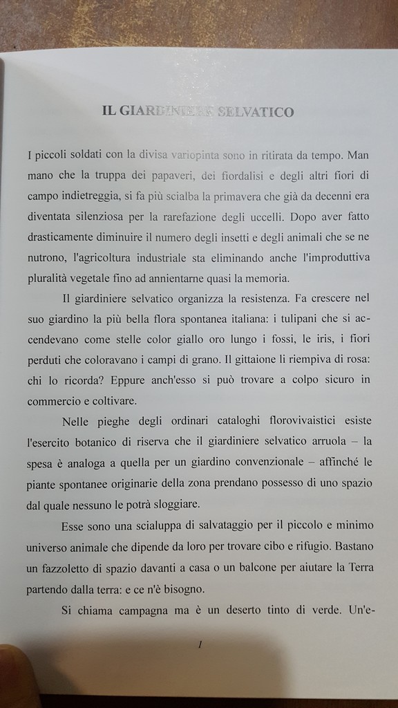 Il libro è una lettura rinfrescante nel settore della manualistica, afflitta da pubblicazioni ripetitive e non centrate sull’Italia. Il piglio rigoroso di chi si basa sui fatti e una scrittura asciutta e senza fronzoli sono caratteristiche del giornalismo vecchio stile, abituato a fornire informazioni da cui i lettori traggono poi le loro deduzioni. Piva spiega subito che un giardino selvatico non è una ricerca sentimentale della pianta coltivata dai nonni, né un ripristino ecologico, per il quale servono competenze elevatissime, esperienza professionale e conoscenza delle Scienze Naturali. Il giardino selvatico è uno spazio, magari piccolo ma gradevole, che “accoglie la piccola natura del posto”, opponendosi all’impoverimento progressivo e alla sua scomparsa. Con il termine “natura”, Piva intende tutta la natura, quindi anche i piccoli animali e gli insetti. Inoltre il giardino selvatico è a portata di gestione di mani da principiante, o di chi ormai ha troppi inverni sulla schiena. Può essere realizzato in spazi davvero esigui, dal balcone al piccolo cortile di città, fornire anche un po’ di piante per la cucina ed essere al contempo anche molto bello, grazioso e profumato. Oltre al piacere di vedere un po’ di vita che vi si insedia o che vi transita.
