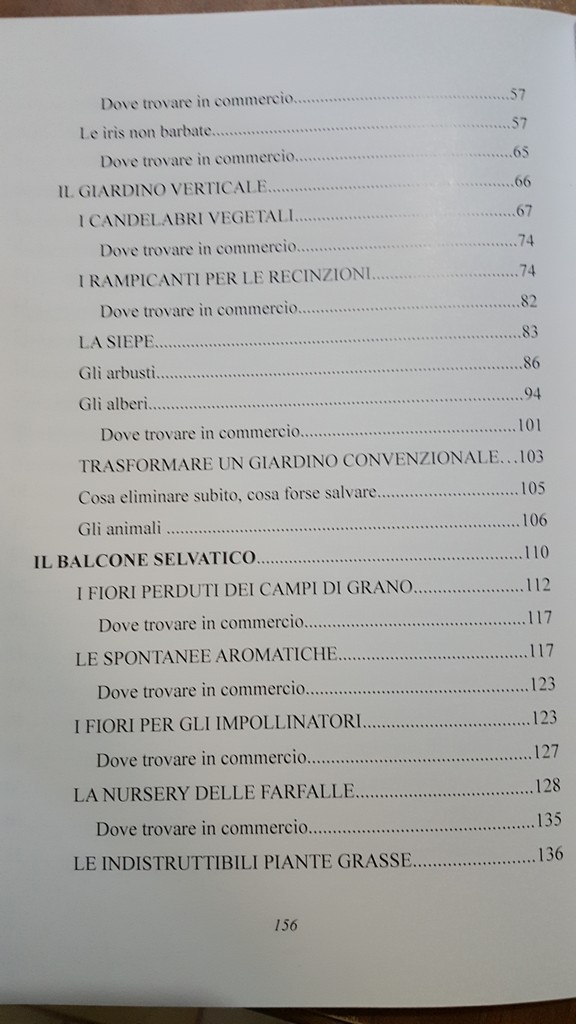 Il volume affronta generi e specie spontanee per utilizzo, aiutando così una ricerca veloce tra le pagine: dal prato al balcone, alle zone in ombra al sostegno di farfalle o altri insetti. Un capitolo molto interessante è dedicato alle siepi. Le siepi di campagna sono state il baluardo della fauna e in parte della flora selvatica. Soppiantate da divisori metallici o alla meglio da file di alberelli in monocoltura, le siepi miste erano riserva di cibo e protezione, nicchia ecologica privilegiata. Non mancano indicazioni sulle rampicanti, sulle piante amate dagli insetti impollinatori, che sono fondamentali nella frutticoltura, e sulle piante alimentari. Per ogni tipologia di piante c’è un apparato di foto e una serie di link e indirizzi per conoscerle meglio botanicamente e per l’acquisto in rete. Le ditte semenziere consigliate sono affidabilissime, da numerose ho acquistato semi con ottimi risultati. Non mancano indicazioni semplici e molto comprensibili su come convertire o modificare il proprio giardino, su come comportarsi di fronte a un’incertezza, cosa togliere e cosa lasciare.