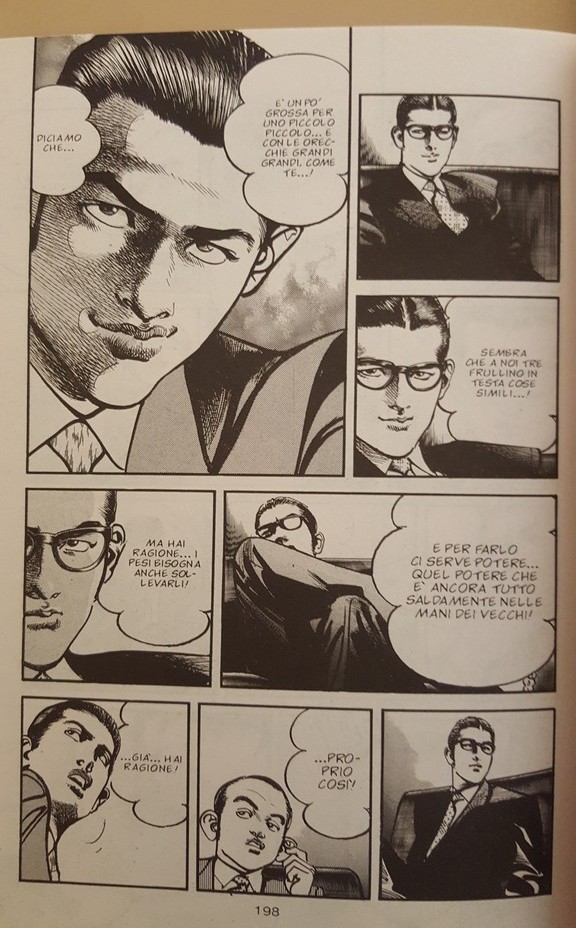 Chiaki Asami e Akira Hojo sono due faccie della stessa medaglia. Hanno affidato l’uno la vita nelle mani dell’altro da ragazzini, in un campo di prigionia in Cambogia. Darebbero la vita l’uno per l’altro ( e si può dire che Chiaki sia morto al posto di Akira) e vogliono ottenere un risultato, un risultato epocale e quasi mistico, religioso: rendere il Giappone il loro santuario. O meglio, far tornare il Giappone ad essere un santuario, un paese degno e non corrotto. Per farlo si dividono i compiti, uno diverrà un uomo politico e l’altro un boss della yakuza. Qui capiamo benissimo che Buronson ci dice con grande chiarezza che il potere governativo è legato a doppio filo con la criminalità, che -come in ogni stato capitalista- non è indipendente né autonoma, ma prende ordini dal governo. Anche in Italia è così, se qualcuno pensa che la ‘ndrangheta o la camorra non siano al servizio dello Stato Italiano si beva un caffè.