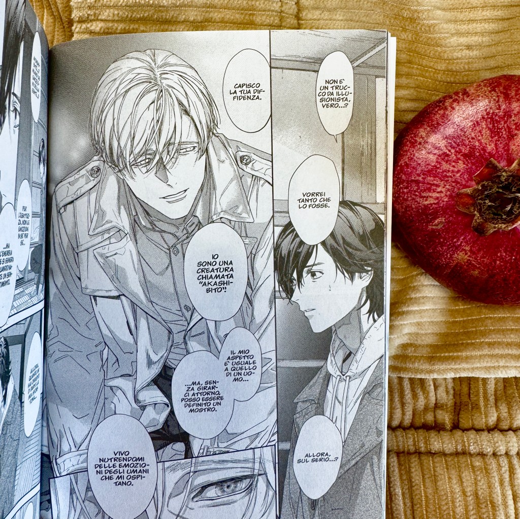 Viene subito alla mente “La lanterna delle peonie” di San’yutei Encho, in cui la carnalità e l’incorporeità sono centrali. Il personaggio principale non è un fantasma, ma un akashibito, uno yōkai che mangia la sfortuna. Detta così poteva uscire una cosa comica alla Rumiko Takahashi, oppure ridicola, ed era questo il mio timore quando l’ho preso. Gli akashibito non esistono, sono un’invezione dell’autrice. Ma c’è nella parola la parte “bito” che viene usata nella reiterazione “hitobito”, un termine che vuol dire “persone”, senza distinzione. Non so se sia un caso, ma questa coda sintattica mi fa pensare a un’allusione al termine “uomo”, “essere umano”. Il Giapponese è una lingua che si presta molto per fonetica e morfologia a questo tipo di semantica.