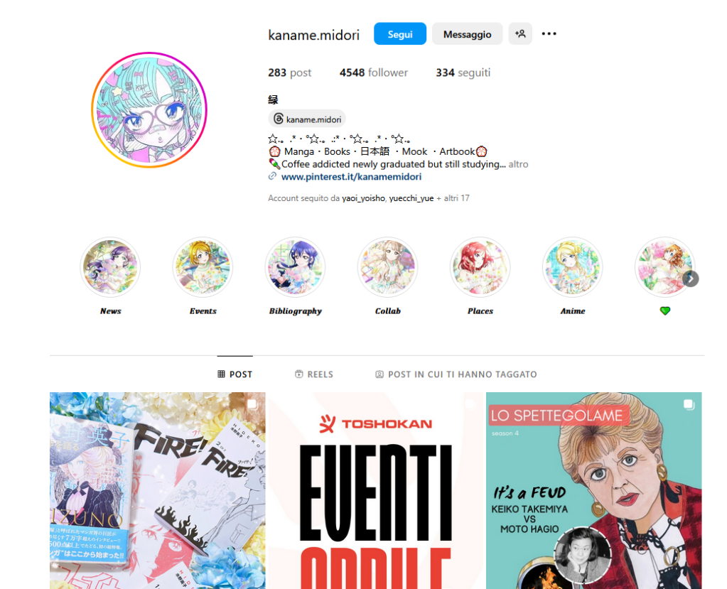 Ludovica Morrone è membro dell’Associazione Italiana per gli Studi Giapponesi e conduce un profilo Instagram di grande successo @kaname.midori .