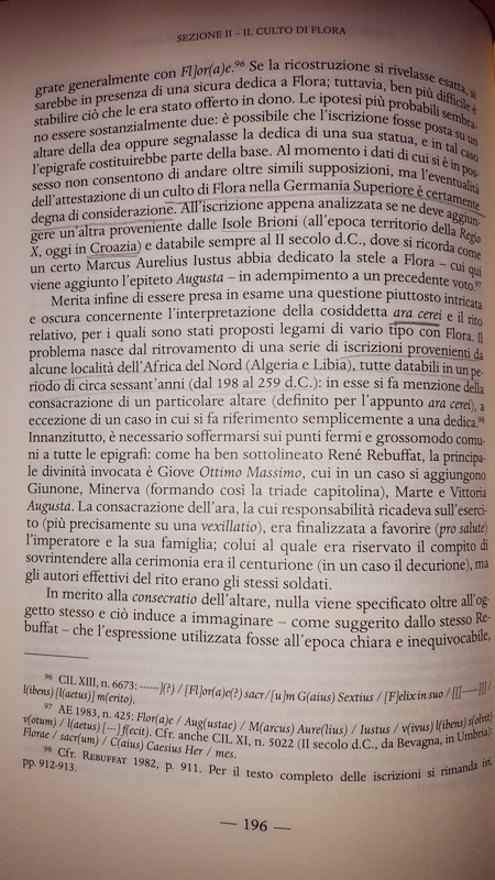 La lettura, seppur trattata con linguaggio accademico e forbito, diventa quasi un giallo sulle tracce di una divinità che oggi immaginiamo carica di fronzoli e persino un po’ fatua, ma che inizialmente era inclusa nella sfera di Cerere, essendo il suo ruolo quello di presiedere alla fioritura delle piante eduli, principalmente del grano (o almeno delle graminacee commestibili in epoca romana) e in generale delle piante utili anche se non alimentari (tintorie, o per la realizzazione di utensili).