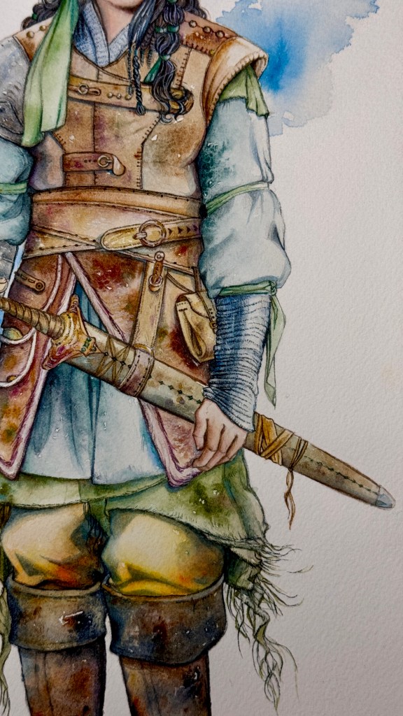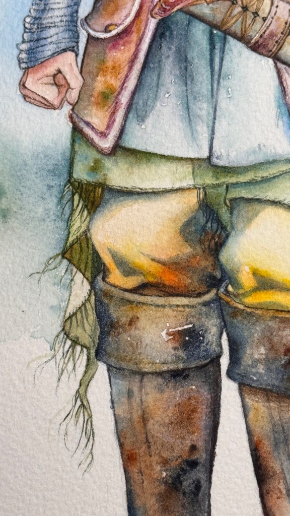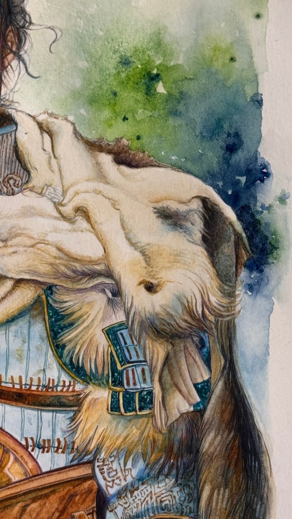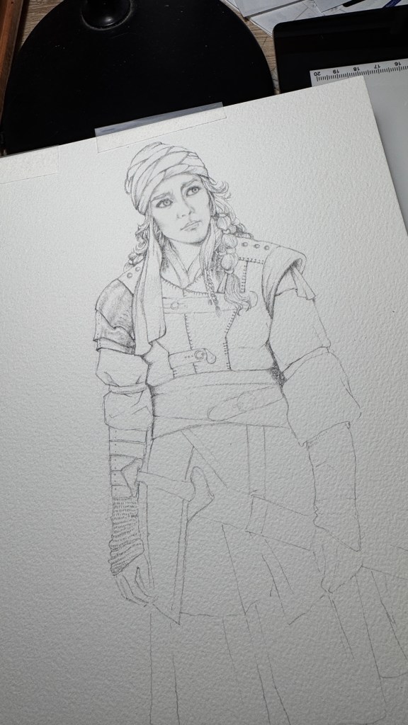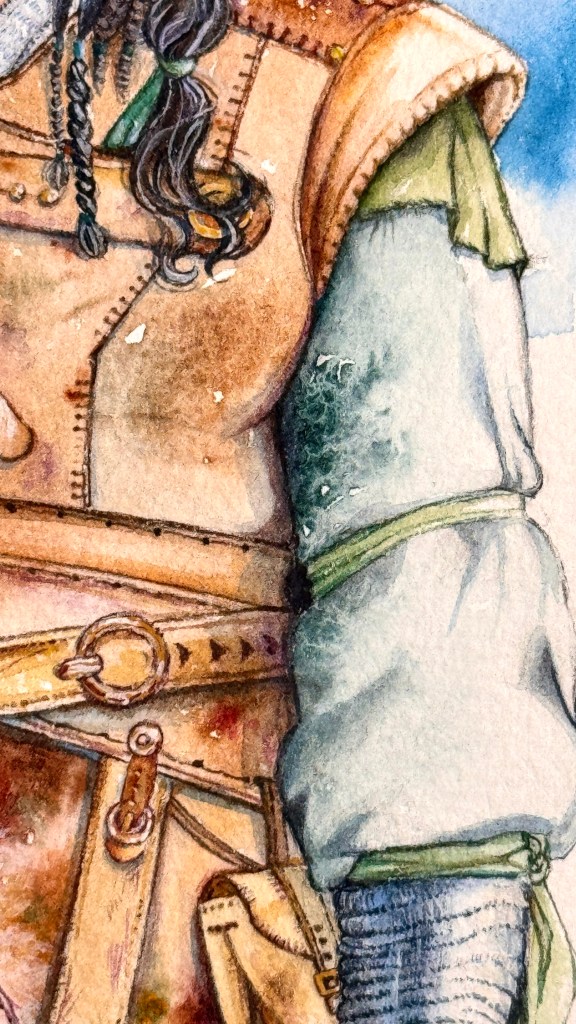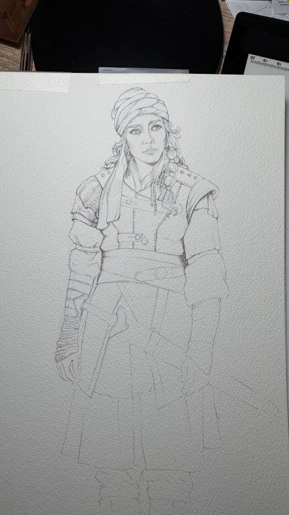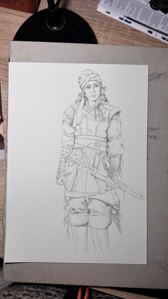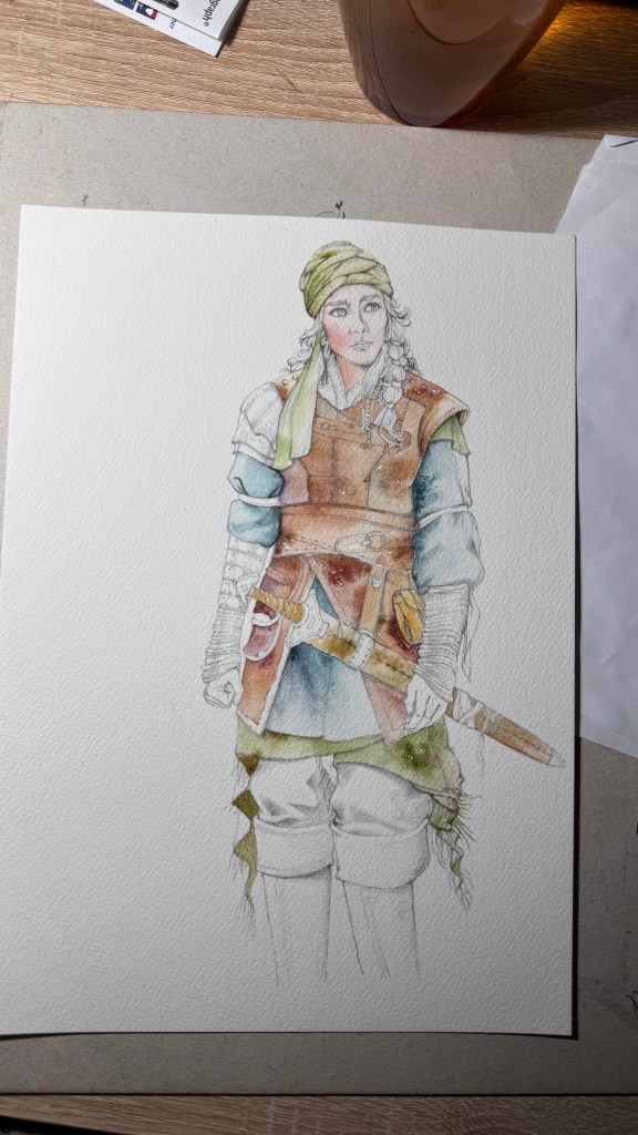 Era da tempo che volevo disegnare un personaggio maschile, e ho scelto qualcosa con cui divertirmi. la pelliccia infatti è stata uno spasso. Un po’ meno le decorazioni, che ho cambiato rispetto all’originale, e che mi sono costate un po’ di errori e rilavorazioni.