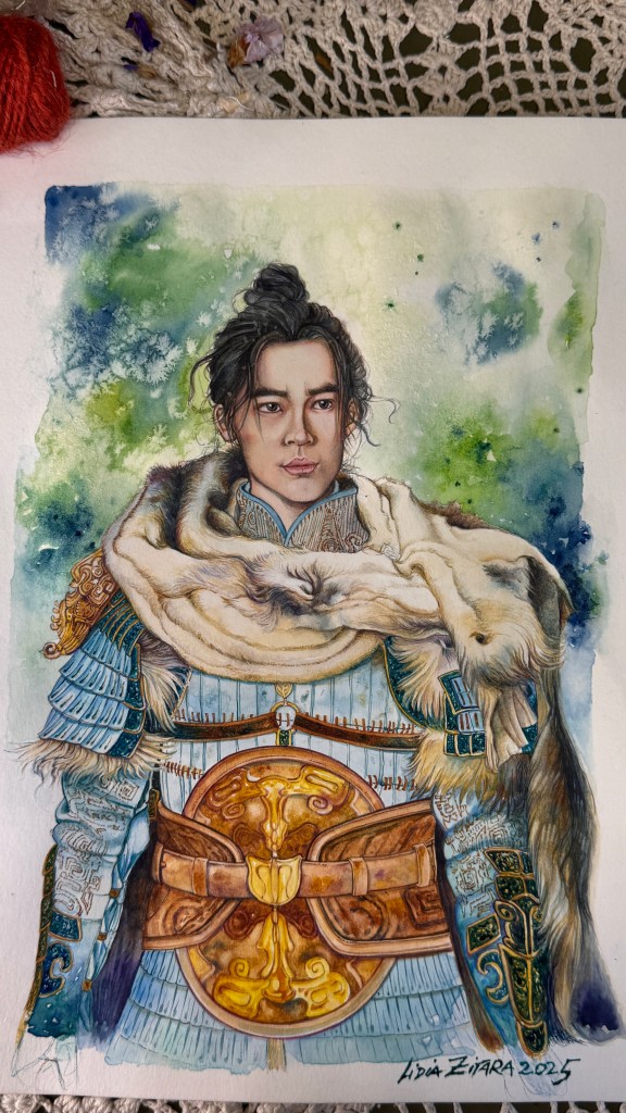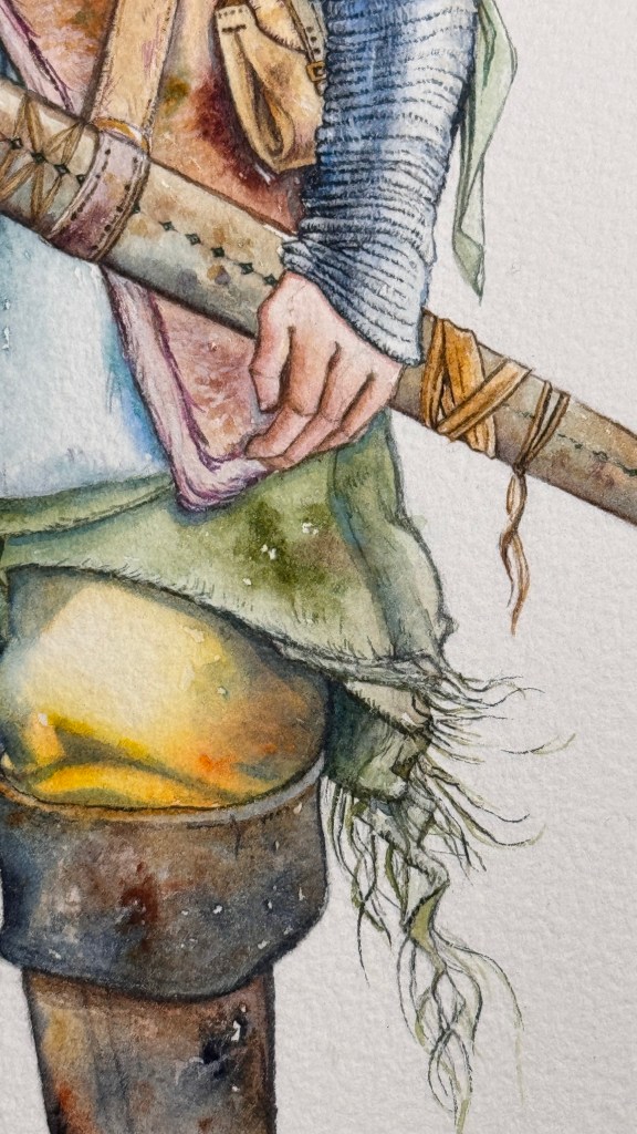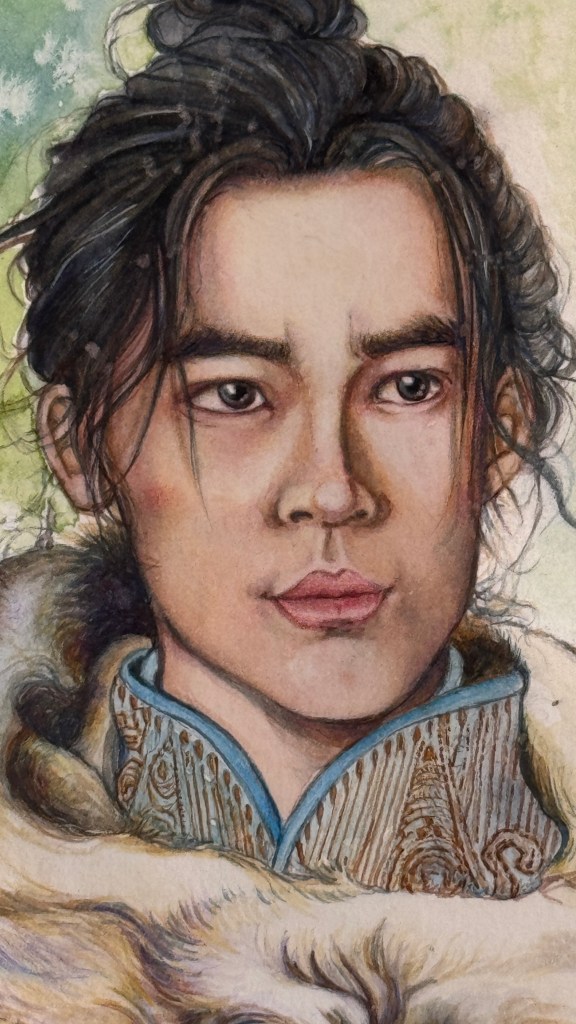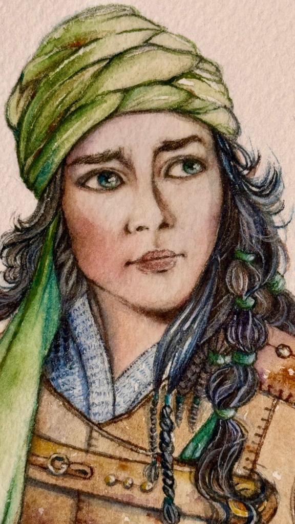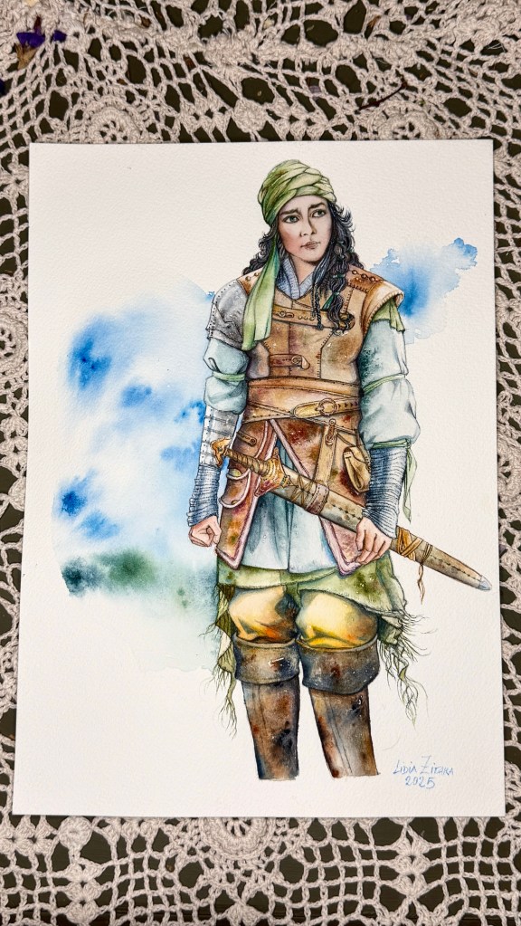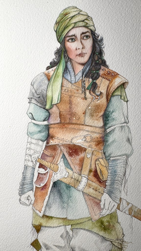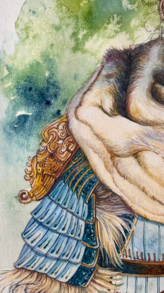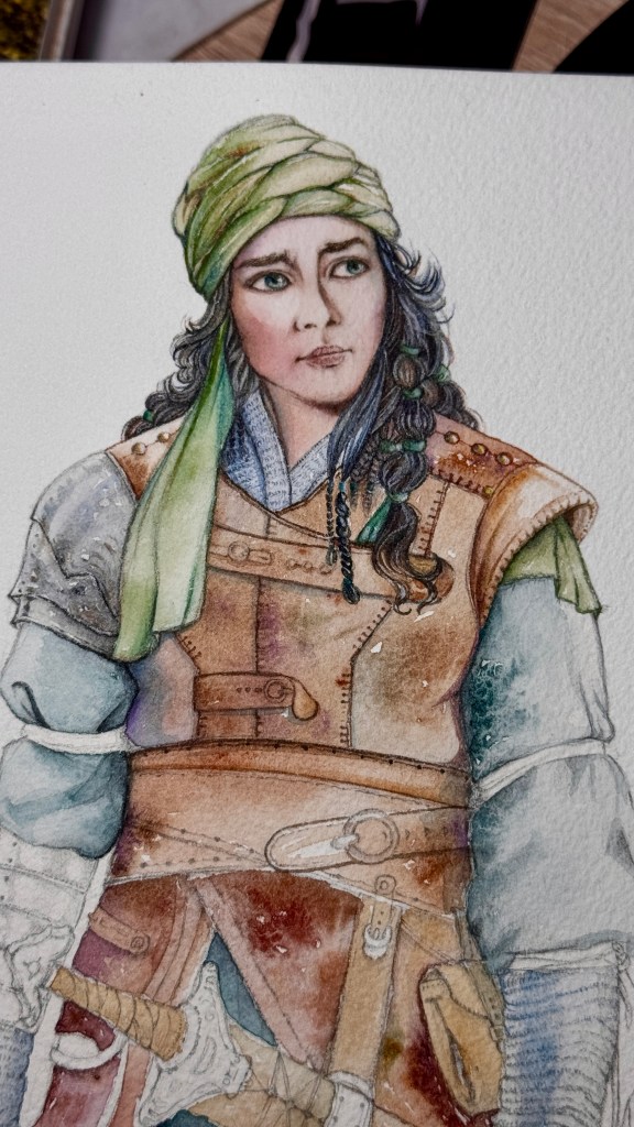 Era da tempo che volevo disegnare un personaggio maschile, e ho scelto qualcosa con cui divertirmi. la pelliccia infatti è stata uno spasso. Un po’ meno le decorazioni, che ho cambiato rispetto all’originale, e che mi sono costate un po’ di errori e rilavorazioni.