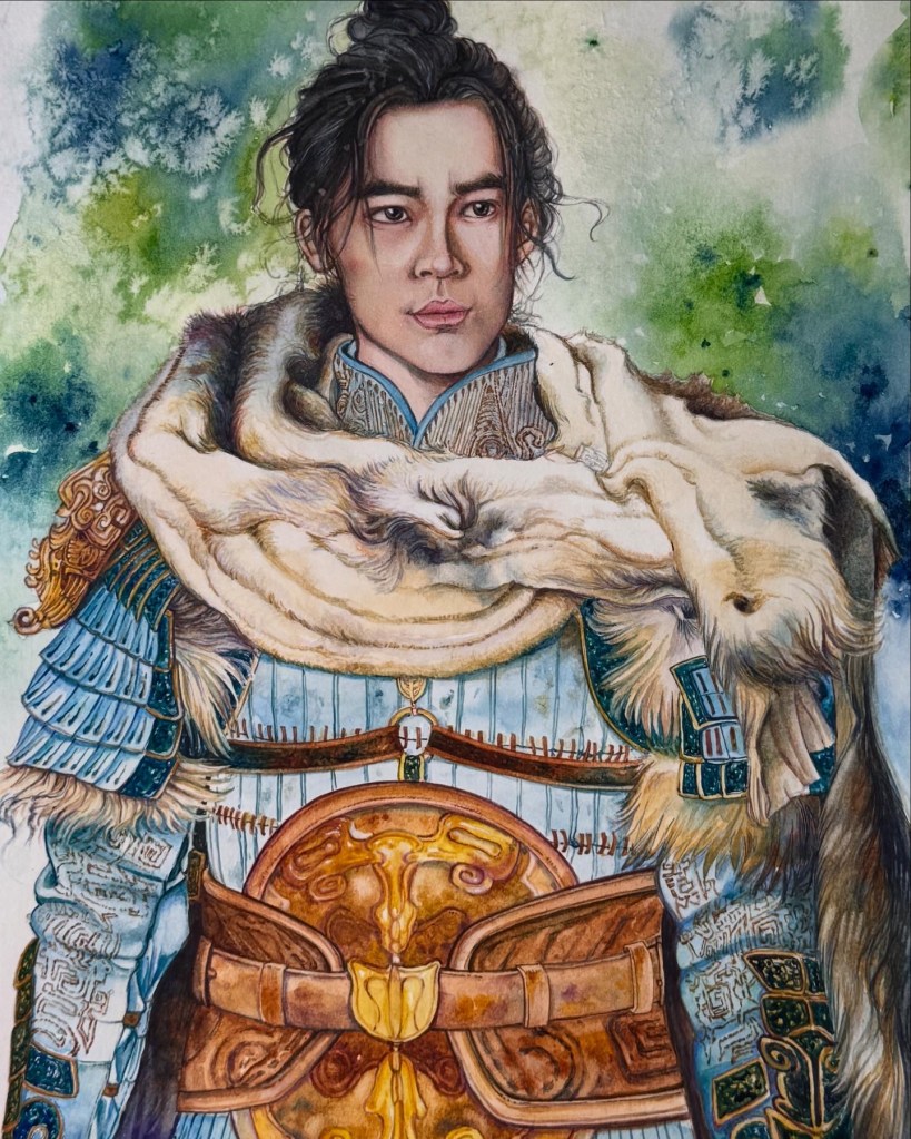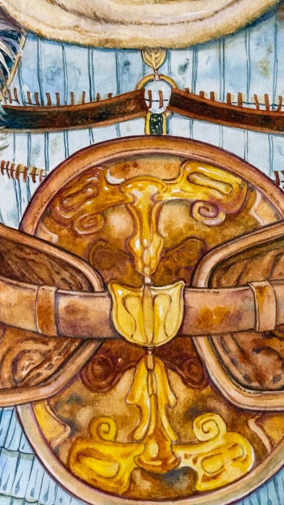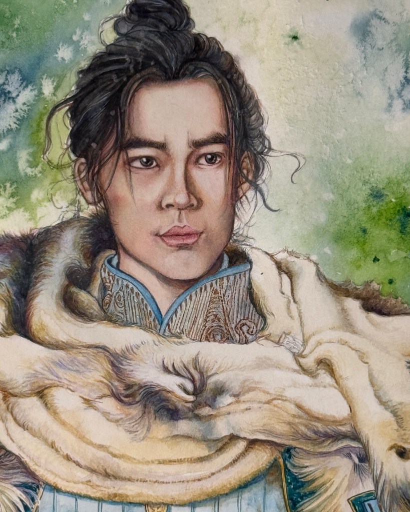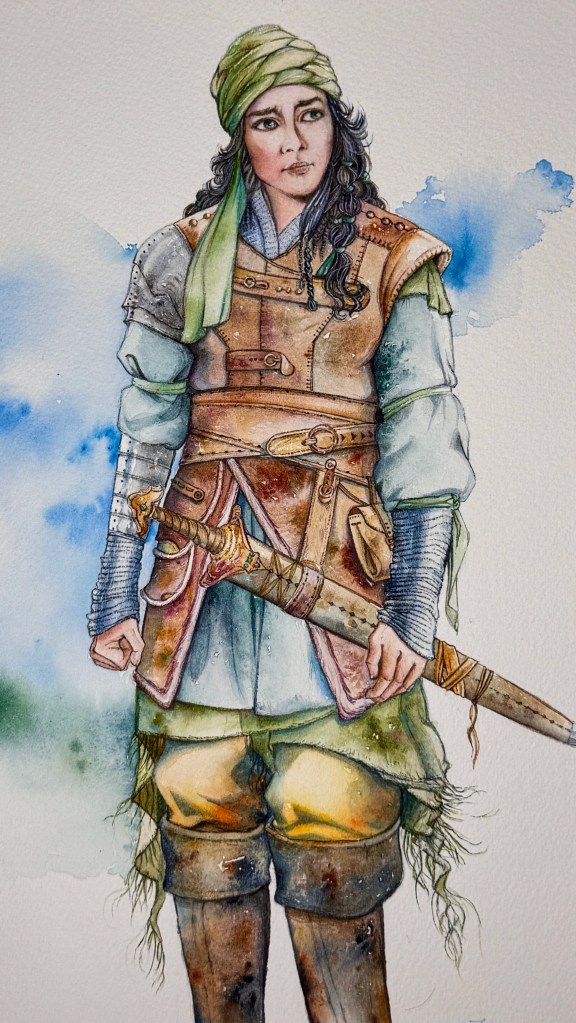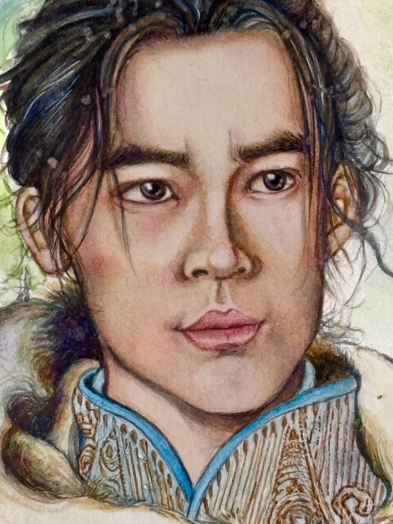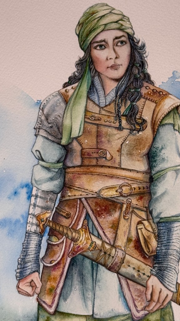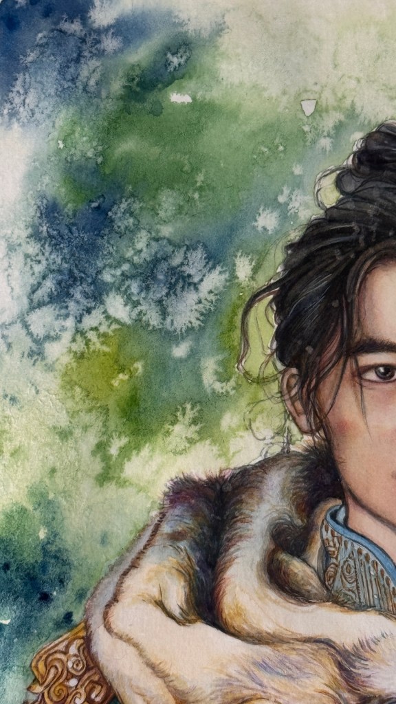 Era da tempo che volevo disegnare un personaggio maschile, e ho scelto qualcosa con cui divertirmi. la pelliccia infatti è stata uno spasso. Un po’ meno le decorazioni, che ho cambiato rispetto all’originale, e che mi sono costate un po’ di errori e rilavorazioni.