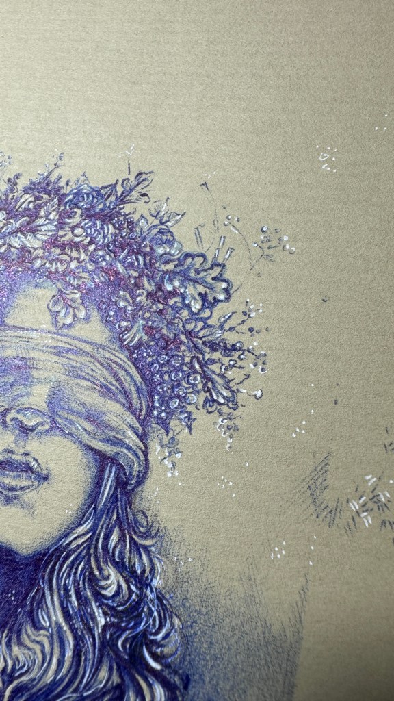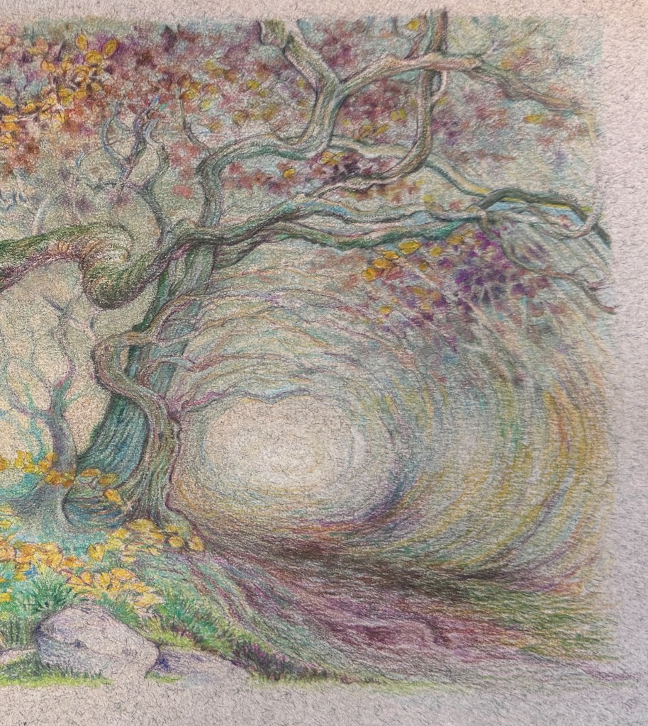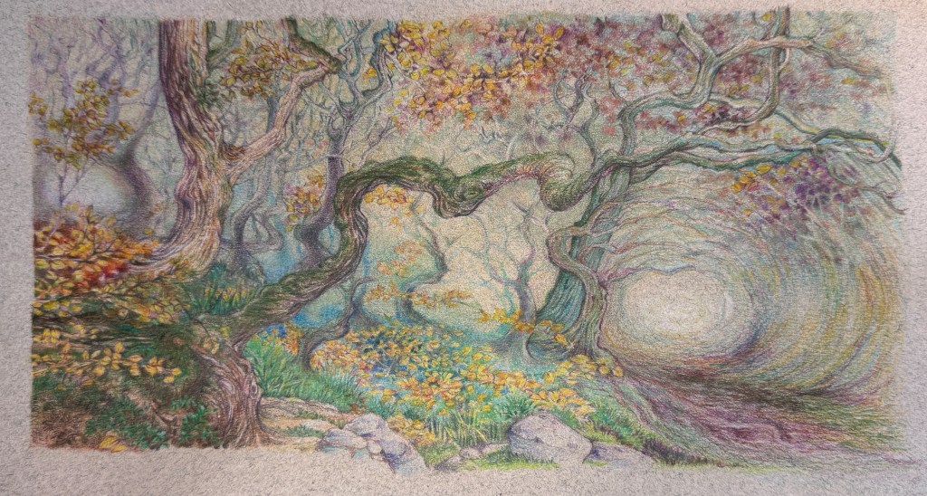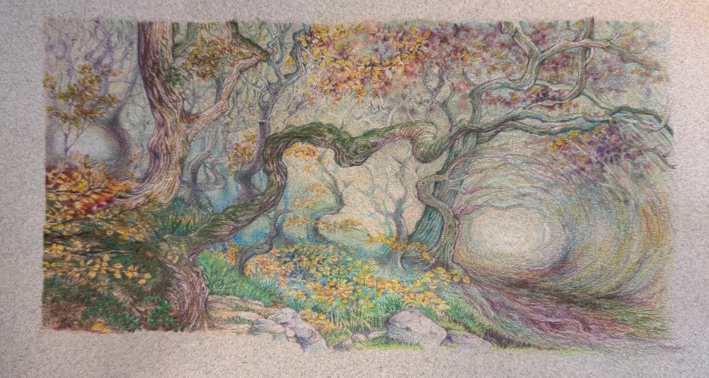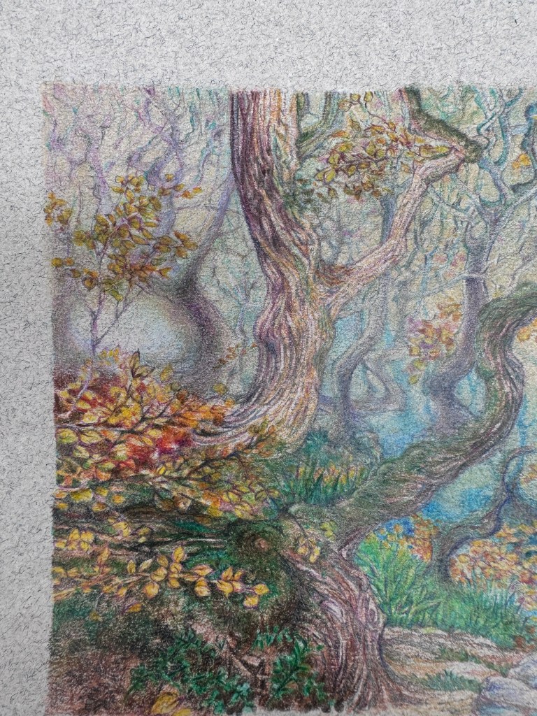 La tecnica è tra le mie preferite, pastelli su carta ruvida, in questo caso la Canson colorata Mi-teintes. Ho usato le matite Caran d’ache, Derwent e Koh-i-Noor. In alcuni punti ho rafforzato con le matite graduate (mi pare una 3B o una 4B).