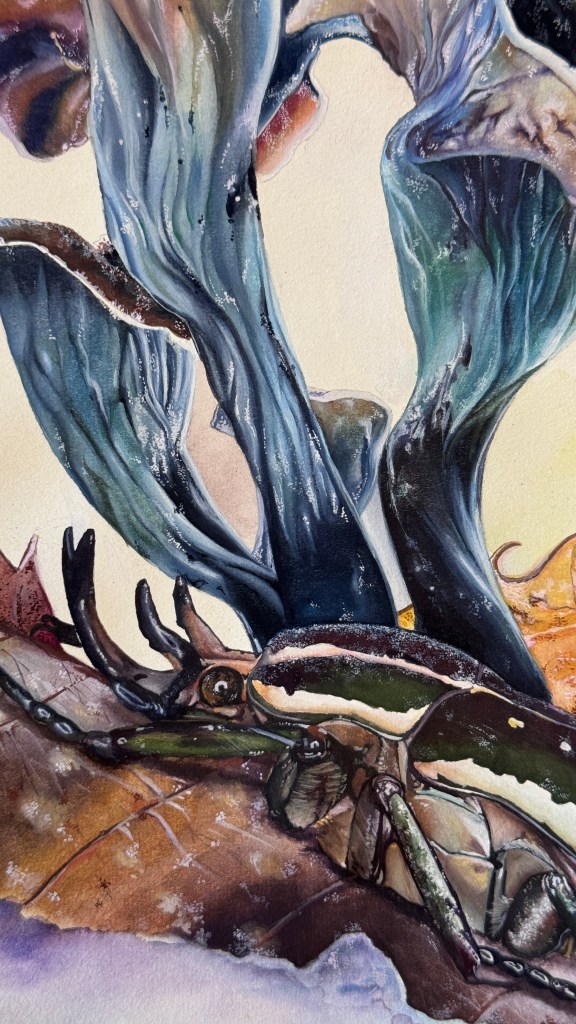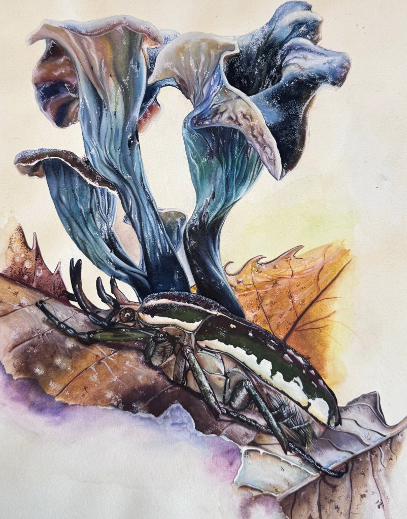 Composizione naturalistica: cervo volante in primo piano e funghi blu sullo sfondo. Tecnica a gouache su carta Schoellershammer, la carta più meravigliosa che esista.