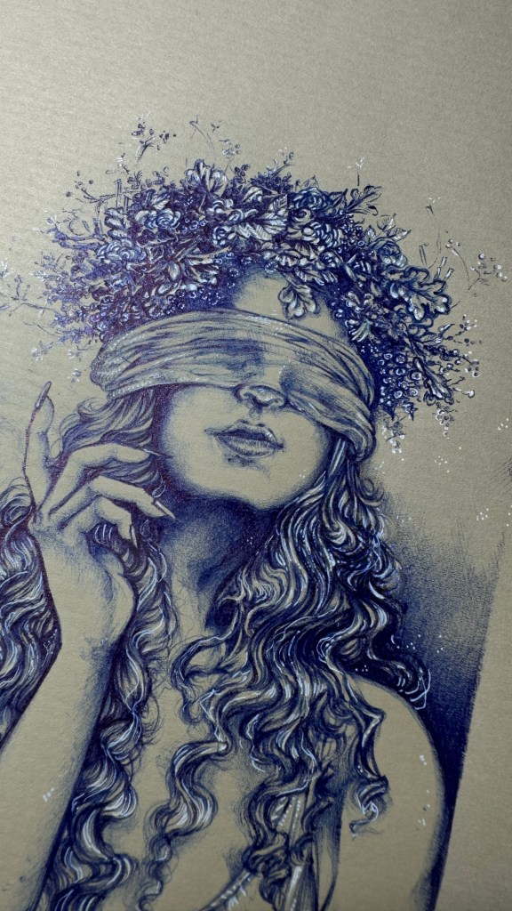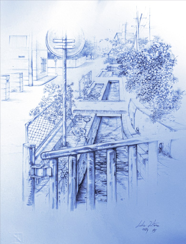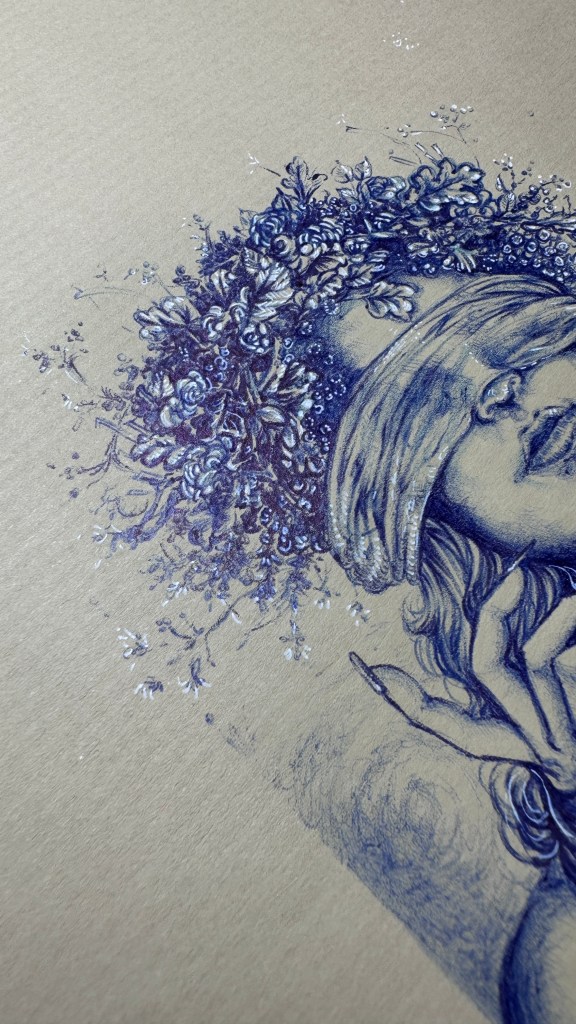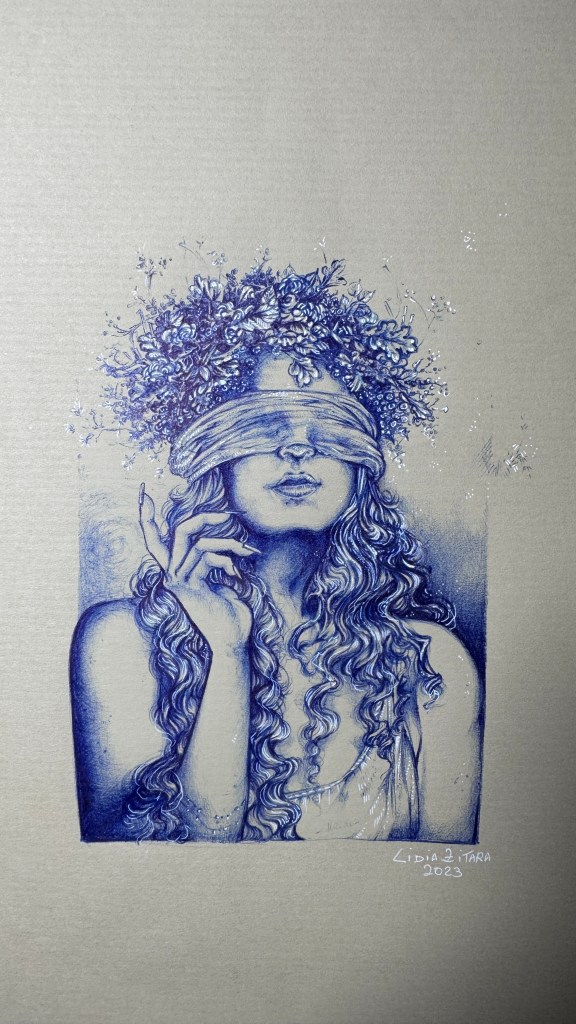 Ricordo bene questo disegno perché mi sono divertita moltissimo nel farlo. Mi piace molto lavorare con le penne, ma non avevo mai usato quelle blu, per di più su carta da schizzo, che tende al crema-giallino e fa un bellissimo contrasto con i blu.