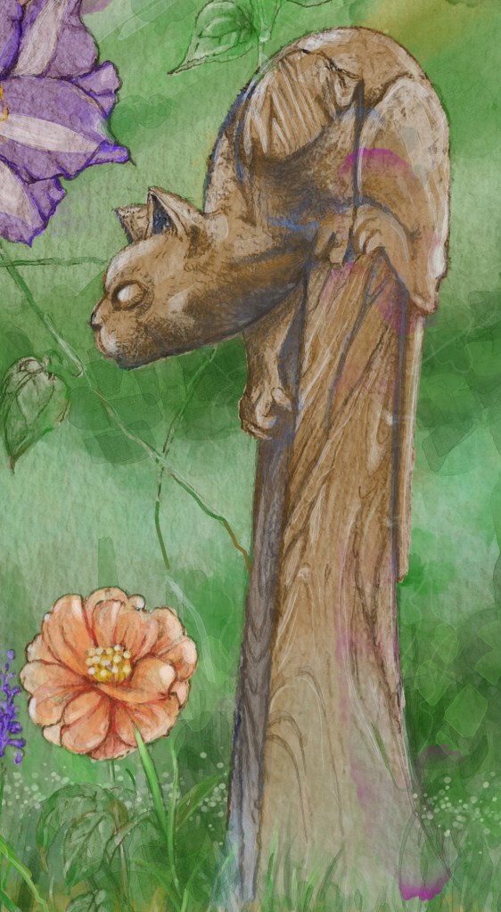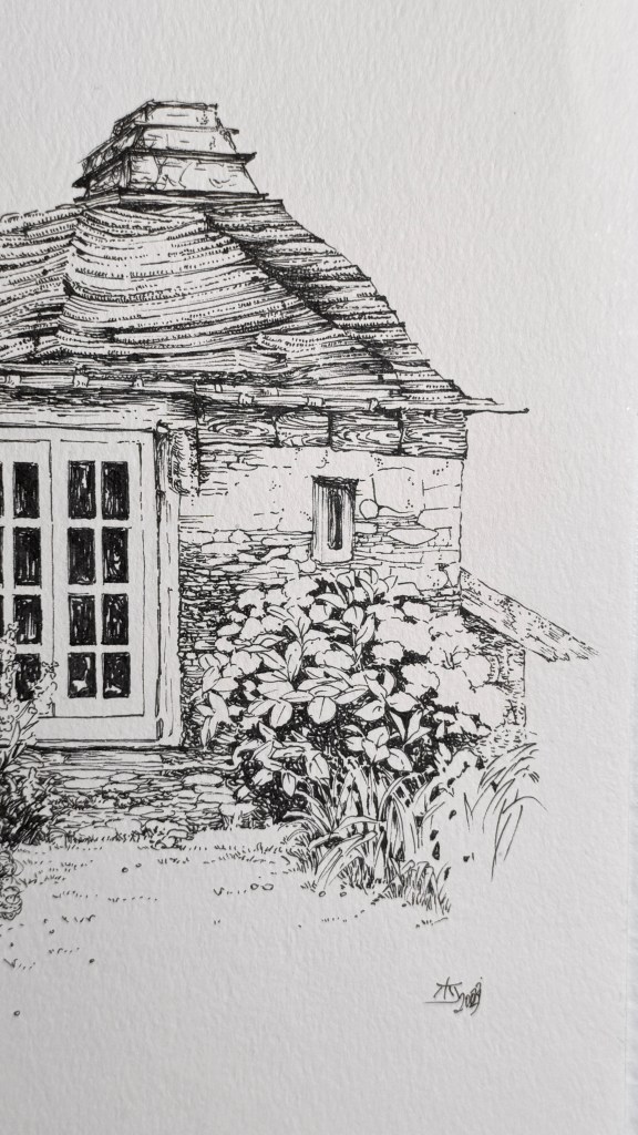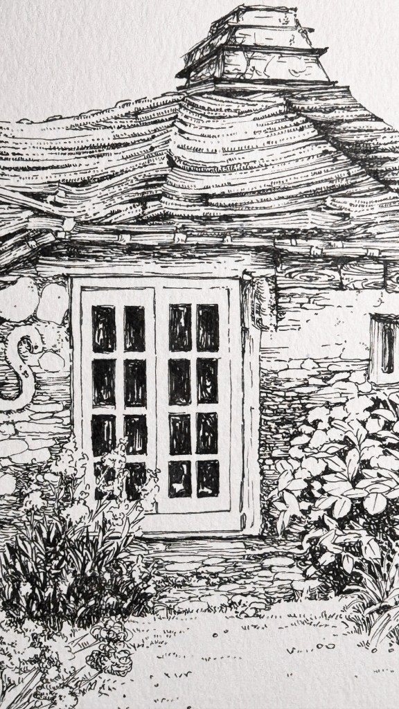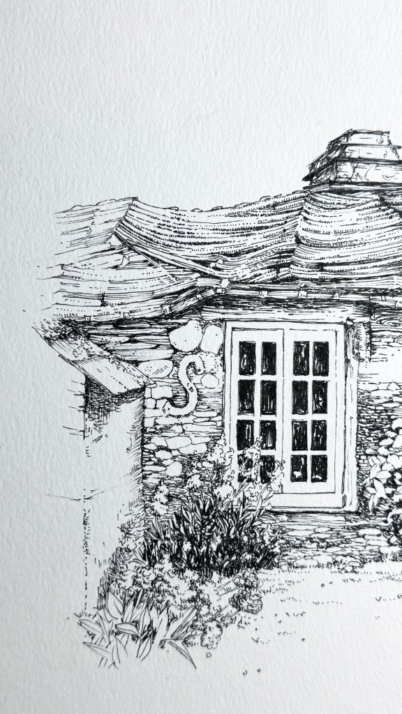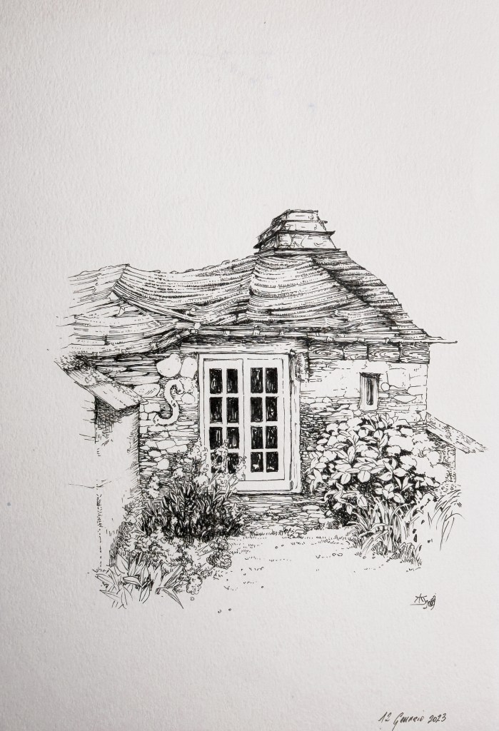 la foto da cui ho tratto questo disegno mi ha sempre affascinata. Era su un vecchissimo «Bell’Europa» degli anni ’90, sull’Irlanda, e raffigura un cottage trasformato in ufficio postale (non so se sia ancora in servizio). Il cottage è molto più grande, io ho compattato le dimensioni, un po’ per errore, un po’ per seguire la mia mano, ormai imprecisa.