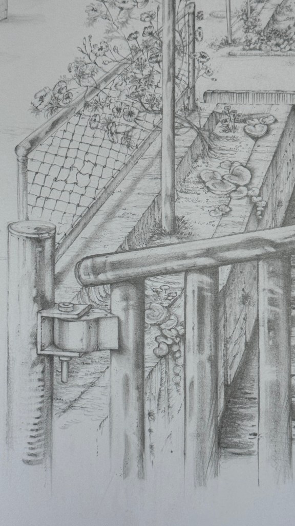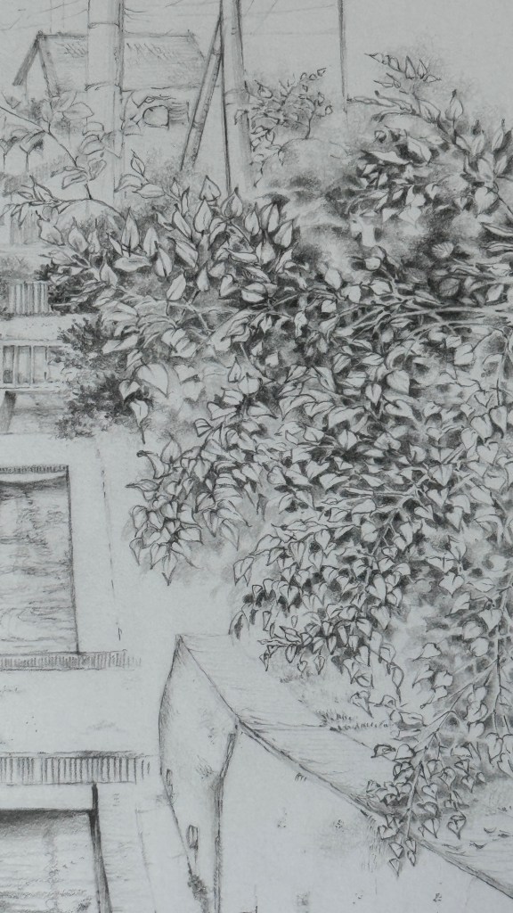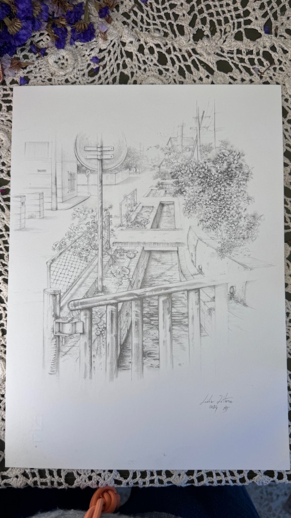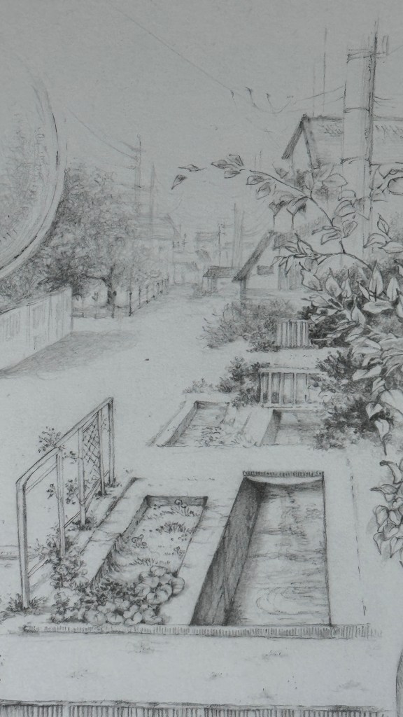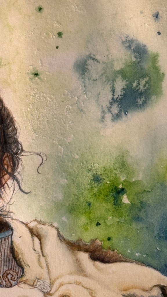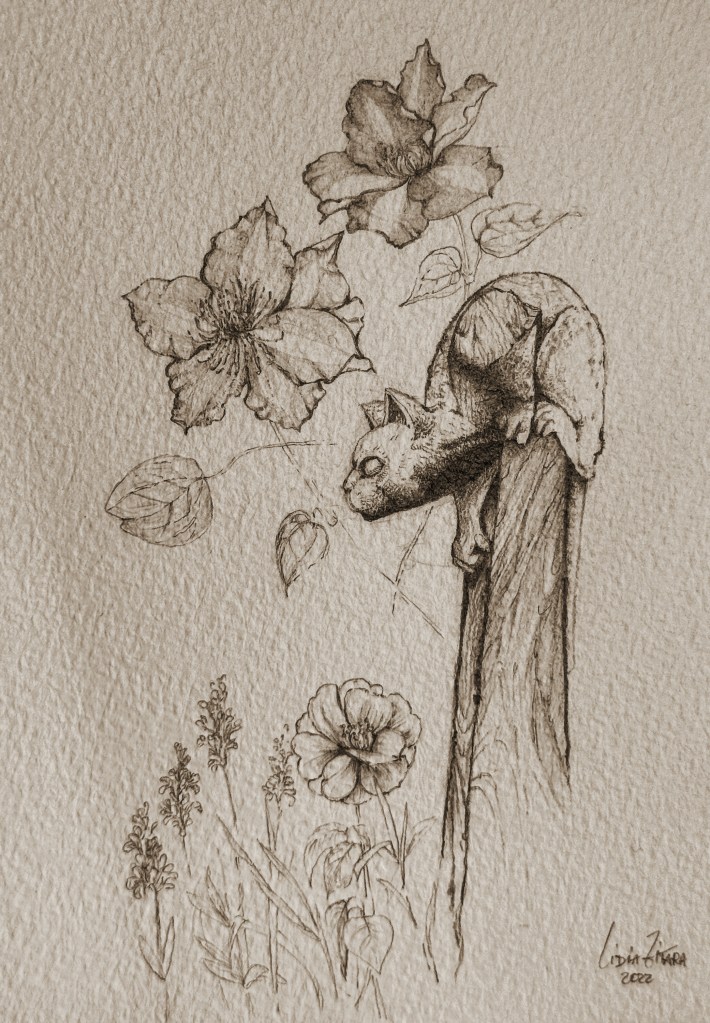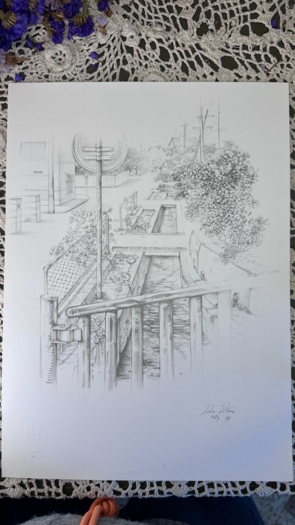 Ecco qualche dettaglio, e ancora più in basso l’originale a matita fatto nel 2022 e una versione “seppiata” attraverso Photoshop (ancora non so farlo con Clip Studio Paint).
