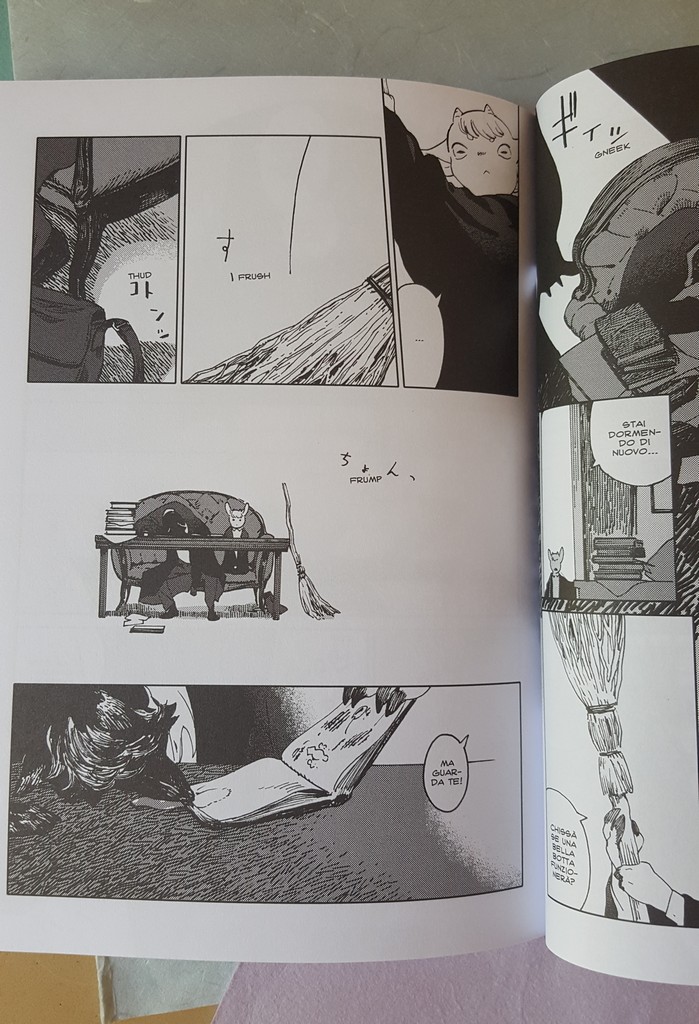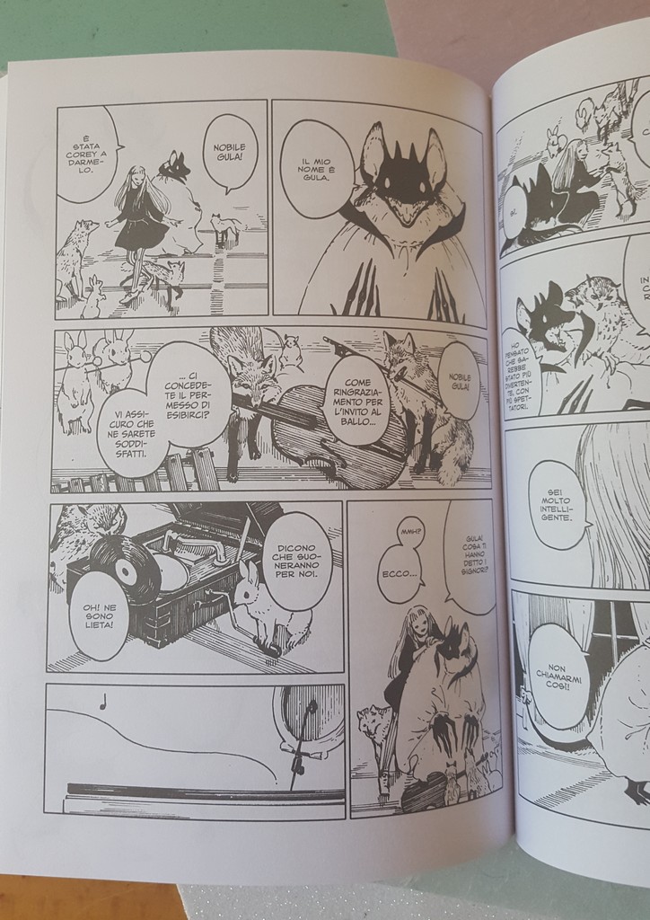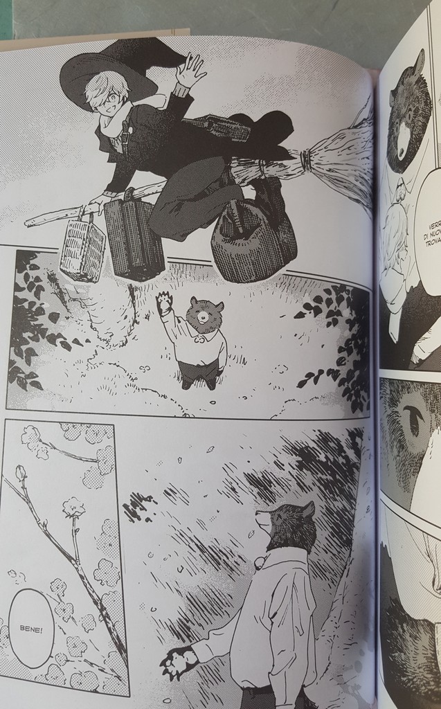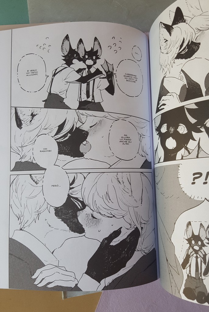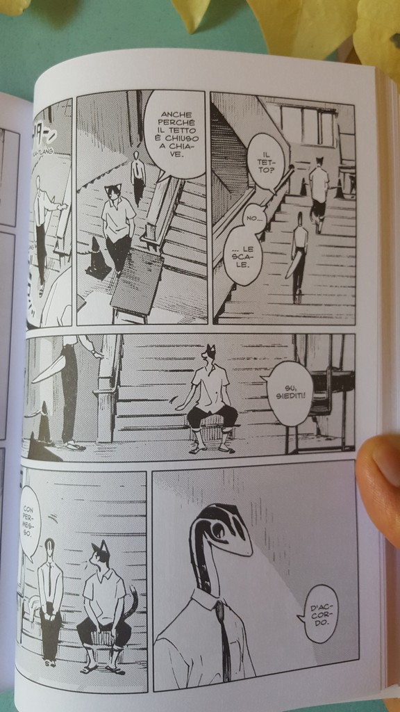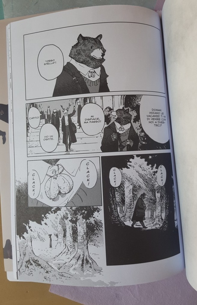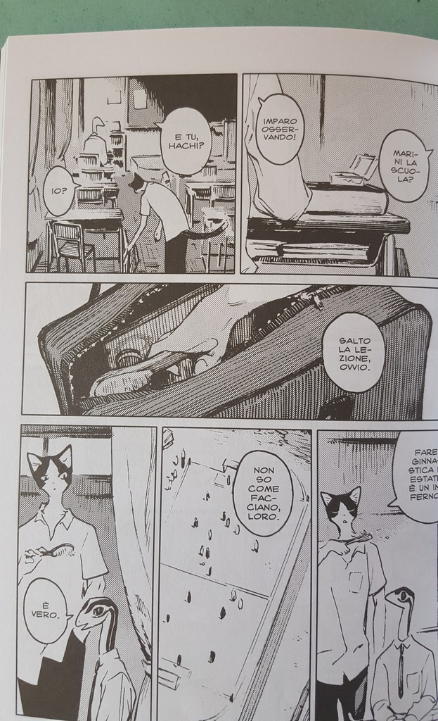 Come sempre belli i dettagli che conosciamo, le scarpe, il drappeggio, le carte, i piccoli oggetti, la resa dei manti degli animali. Un po’ trascurato il tratteggio in favore di una retinatura molto semplice, non riuscitissima l’ibridazione umano-animale, che è uno dei punti di forza di Nagabe, forse perché vessata dalla necessità di associare all’umano la qualità di studente e all’animale quella di “peloso standard”, quasi “pet”.