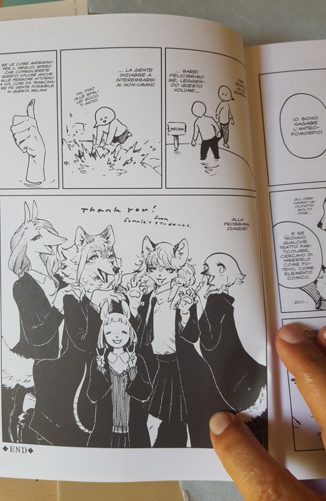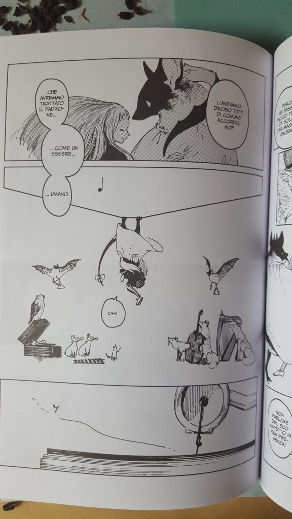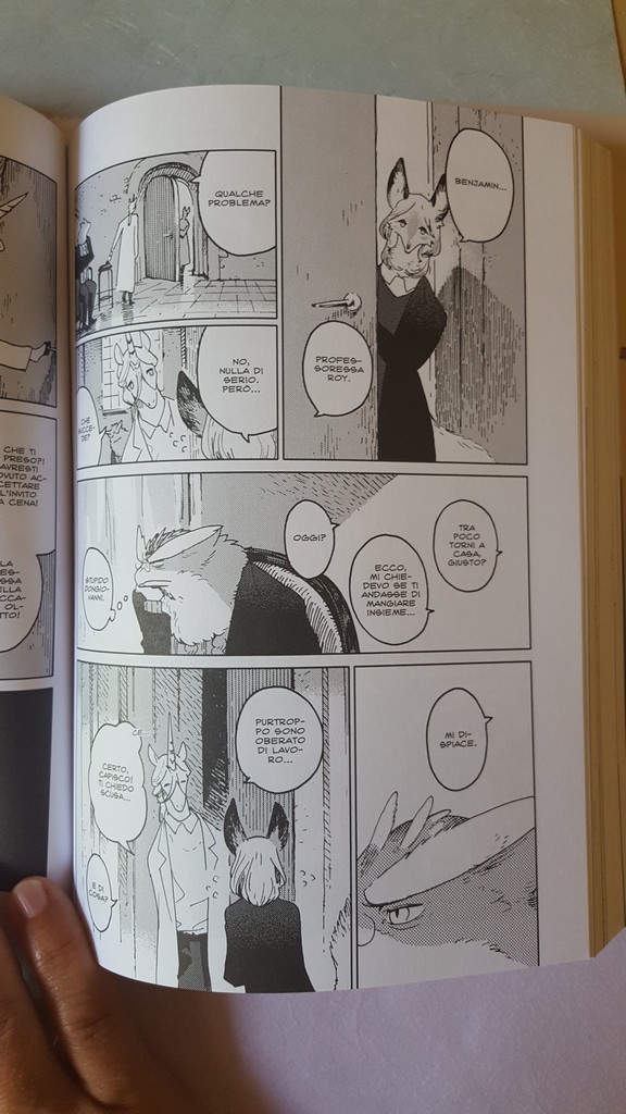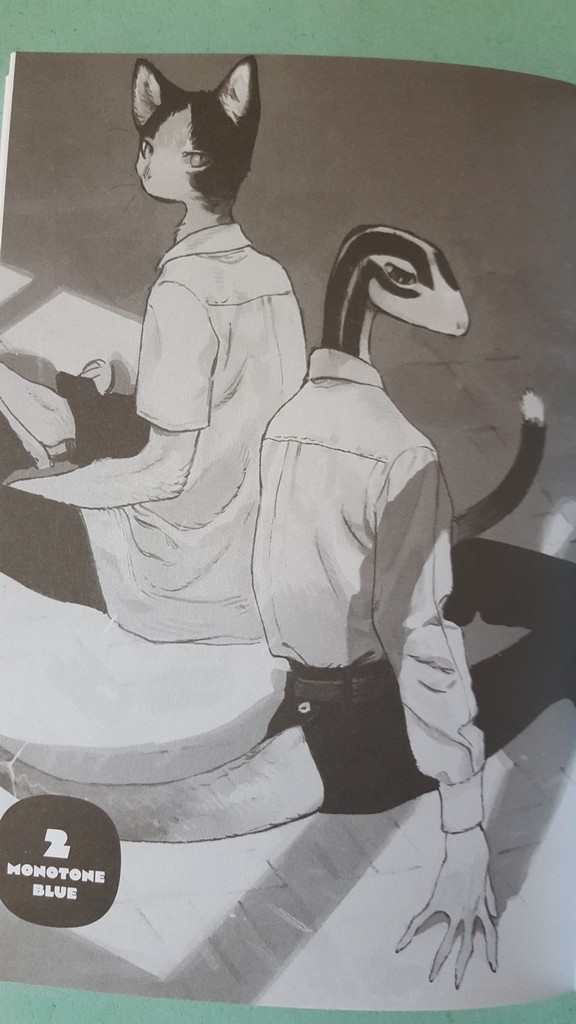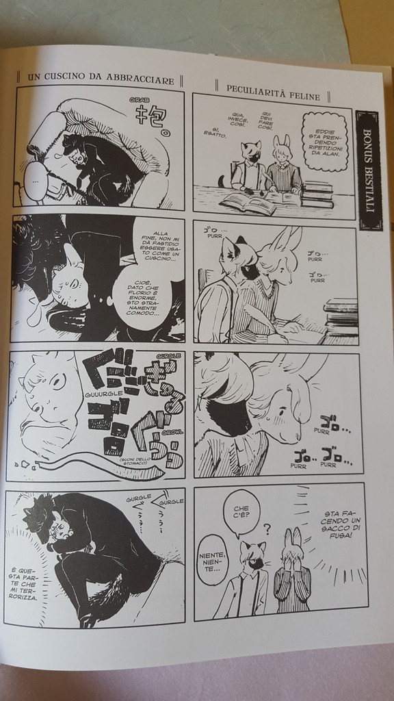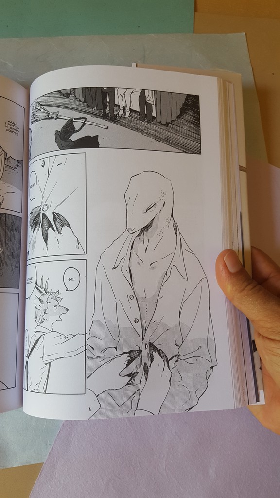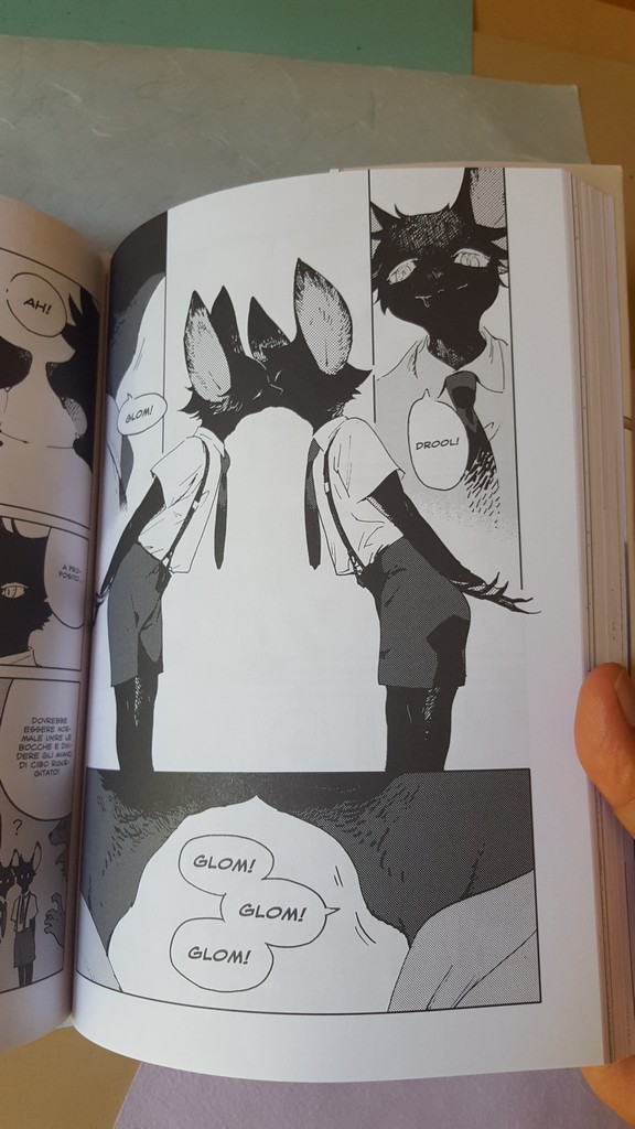 Come sempre belli i dettagli che conosciamo, le scarpe, il drappeggio, le carte, i piccoli oggetti, la resa dei manti degli animali. Un po’ trascurato il tratteggio in favore di una retinatura molto semplice, non riuscitissima l’ibridazione umano-animale, che è uno dei punti di forza di Nagabe, forse perché vessata dalla necessità di associare all’umano la qualità di studente e all’animale quella di “peloso standard”, quasi “pet”.