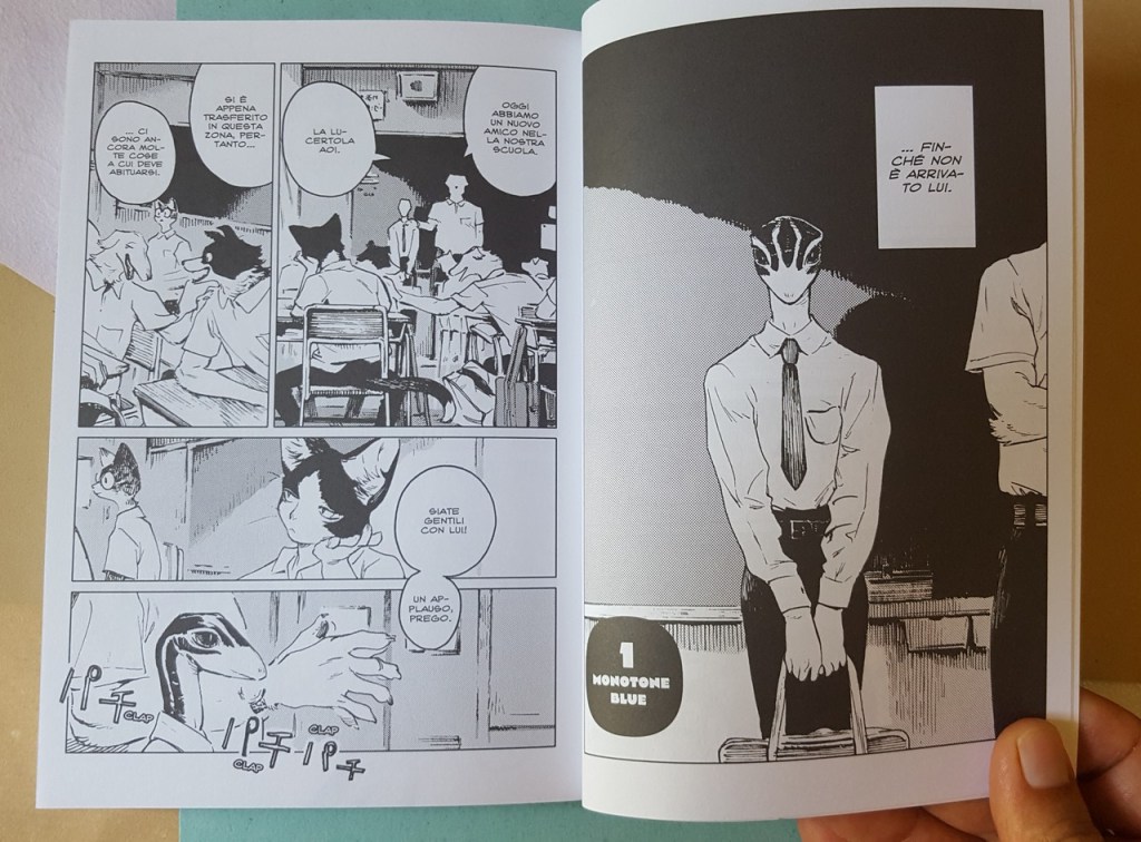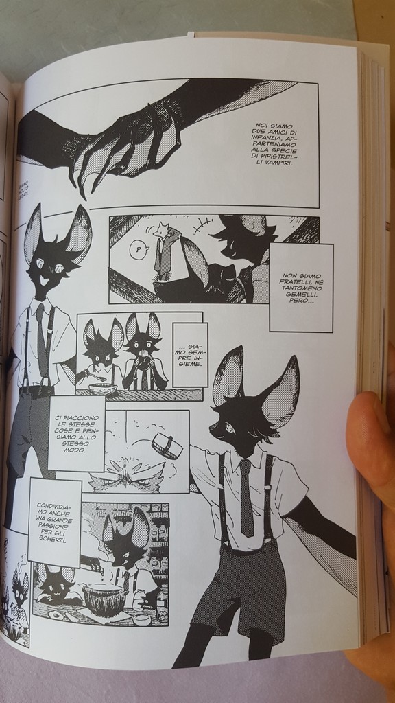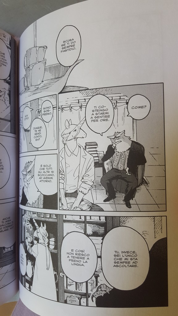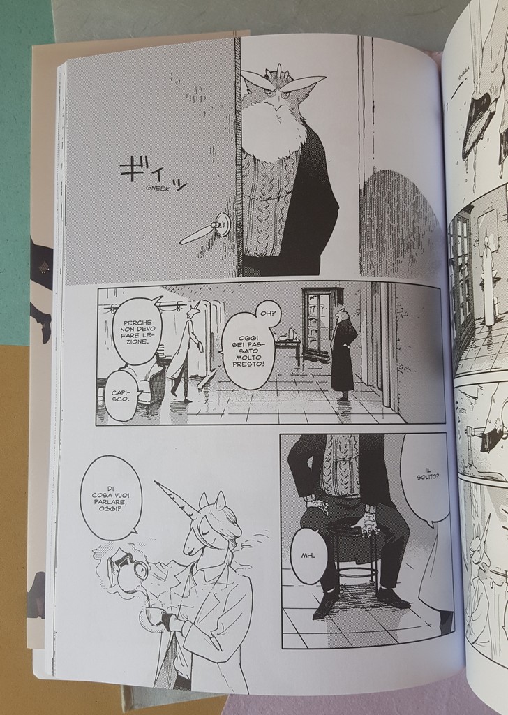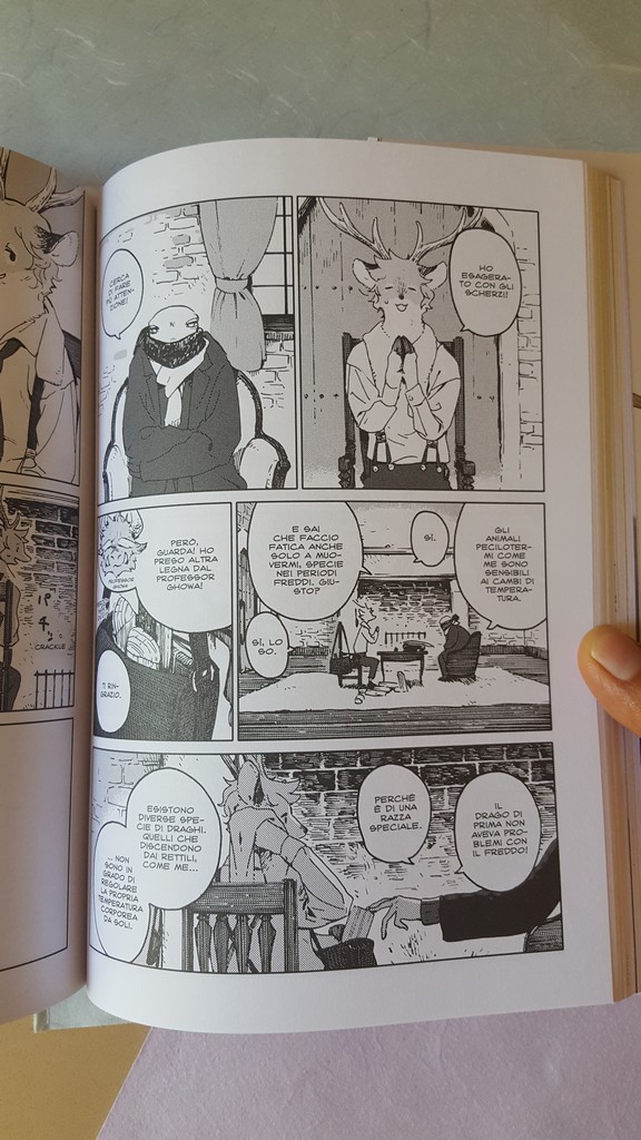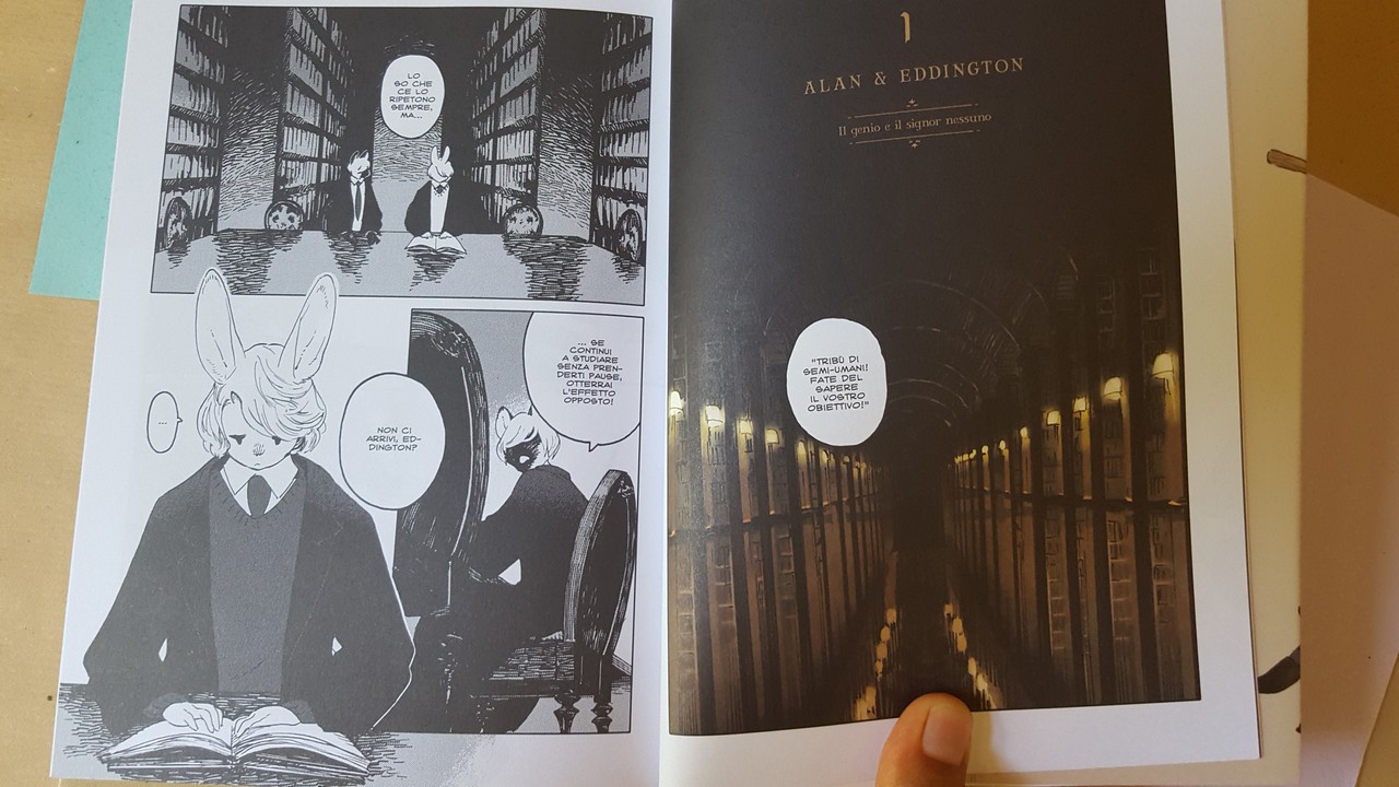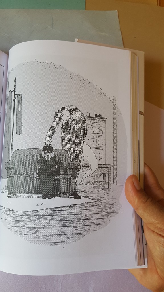 Come sempre belli i dettagli che conosciamo, le scarpe, il drappeggio, le carte, i piccoli oggetti, la resa dei manti degli animali. Un po’ trascurato il tratteggio in favore di una retinatura molto semplice, non riuscitissima l’ibridazione umano-animale, che è uno dei punti di forza di Nagabe, forse perché vessata dalla necessità di associare all’umano la qualità di studente e all’animale quella di “peloso standard”, quasi “pet”.