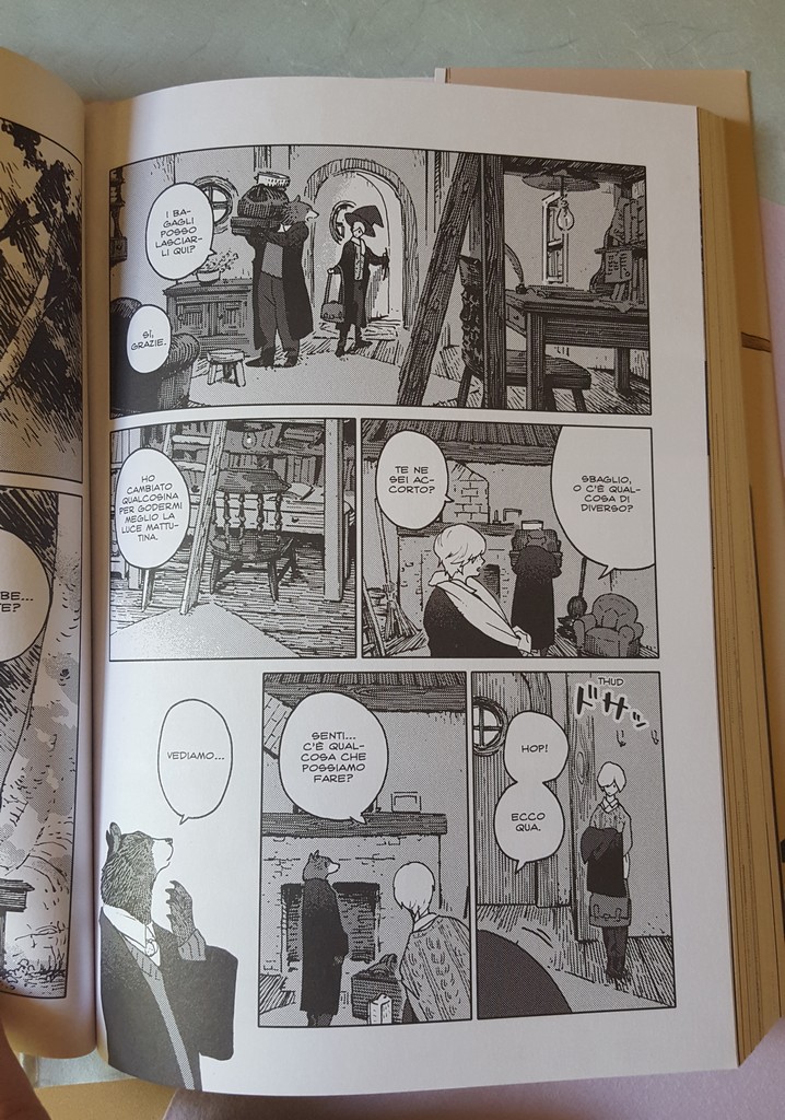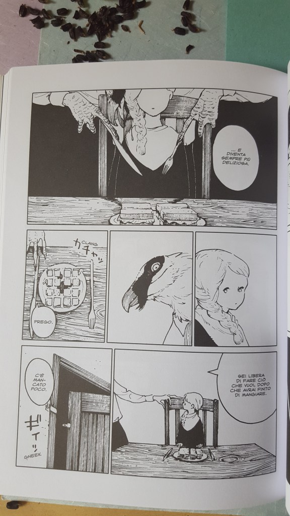 Il romanticismo di Nagabe è il far iniziare il viaggio a coppie che già si conoscono e che hanno instaurato un rapporto di amicizia, il che ci culla nell’idea che sarà un viaggio condiviso e lungo. Bella la scelta dei nomi, che danno un tocco europeo, non solo britannico, senza essere né aulici né banali ma molto fiabeschi (con i nomi europei o americani, i mangaka giapponesi hanno in genere grossissime difficoltà, Nagabe sembra veleggiare perfettamente questo mare).