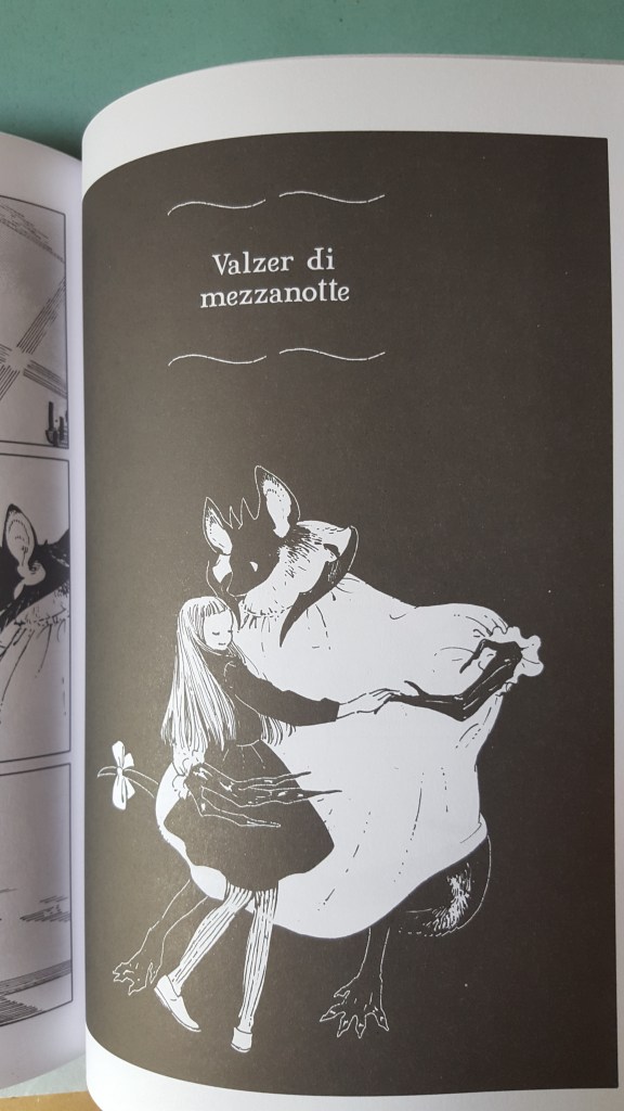 Il riferimento più immediato è l’Arthur Rackham dei Racconti di Mamma Oca , sia per il bianco e nero che traccia silhouette che per la distribuzione dei personaggi nella pagina, aperta e ariosa, in cui sfondi e linee essenziali, come quella del pavimento o del soffitto, vengono rese unicamente dalla posizione dei soggetti e dall’utilizzo accorto e prudente di elementi come oggetti e animali.