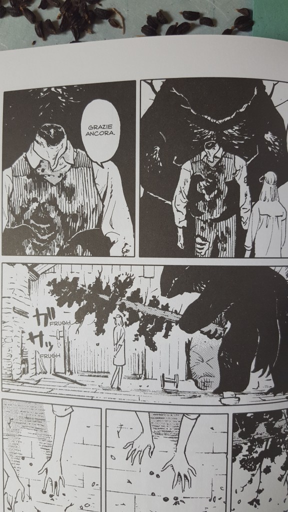 He draws digitally, but his linework always retains a handmade quality, with the smudges typical of charcoal or a soft pencil rubbed sideways on rough paper. You can still see the close lines of pencil and pen sketches, the finesse of the brush. Such attention to the tool used is practically unknown to many Japanese mangaka, who often offer clean, thin, flawless (and anonymous) lines — whereas in Europe, this more personal, handcrafted touch is highly appreciated because it reveals the artist’s individual hand. Uniqueness, recognizability, is always a positive element for European eyes, as it brings the artist closer to the divine act of creation.