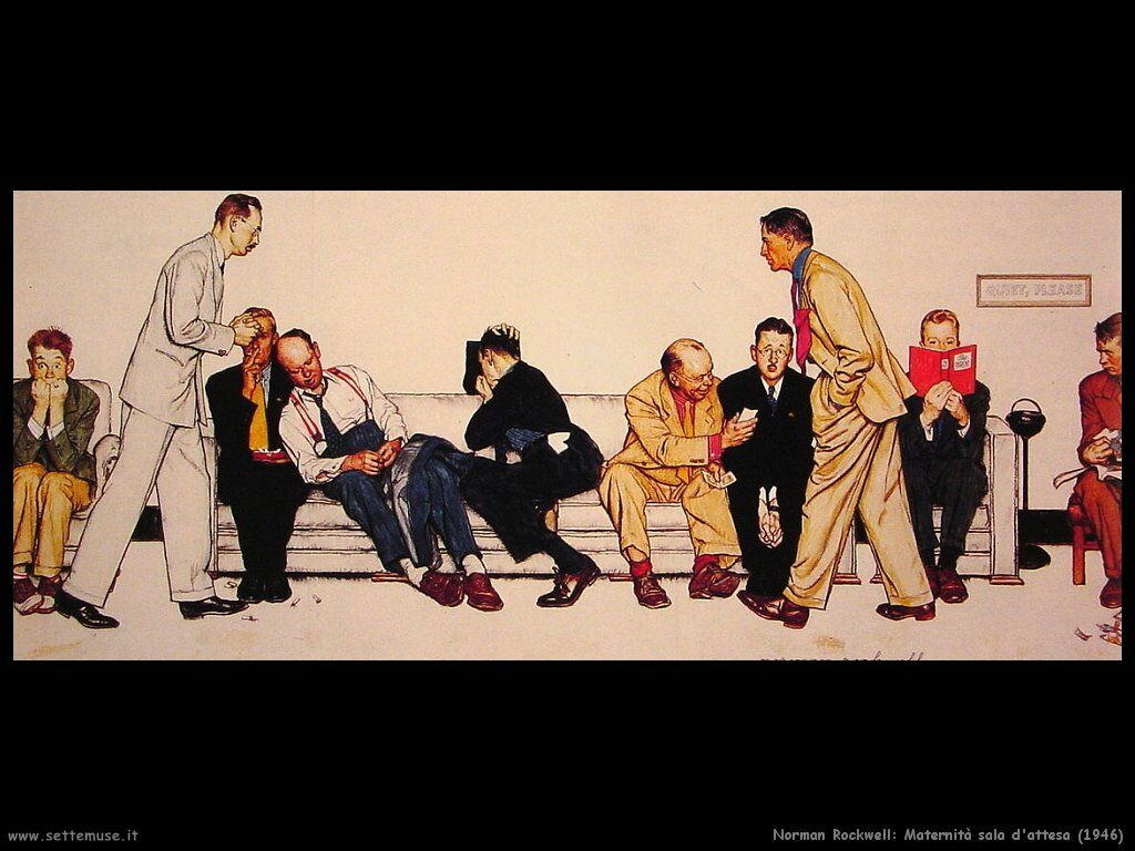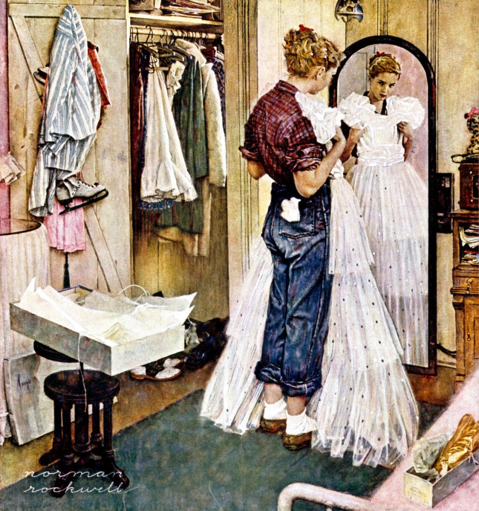 Da Rockwell l’esilità delle figure, ben spaziate e dalle pose ben concepite. Il drappeggio degli abiti, le scarpe molto lunghe, le calze a costine (e molto altro).
