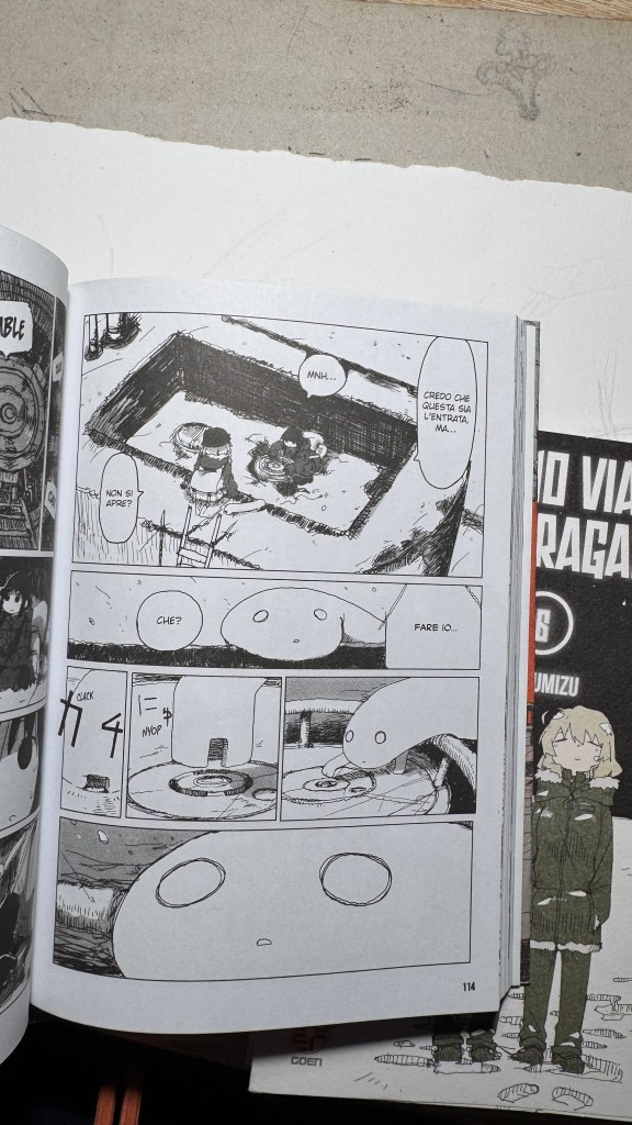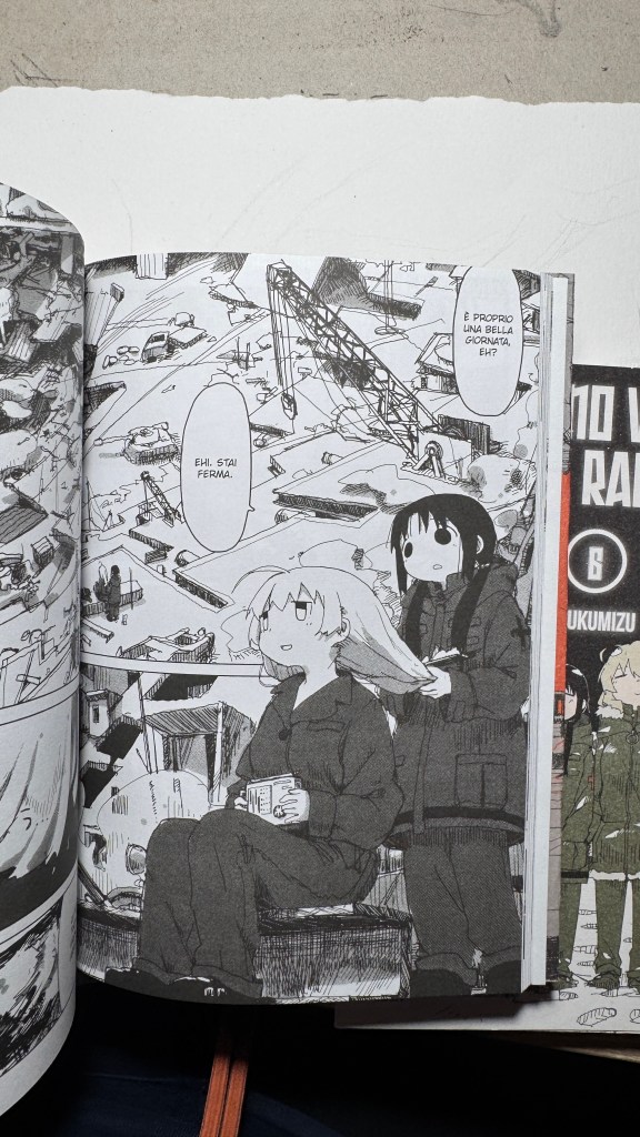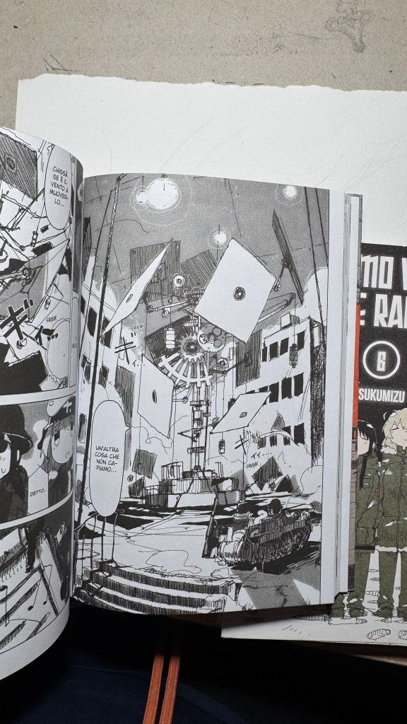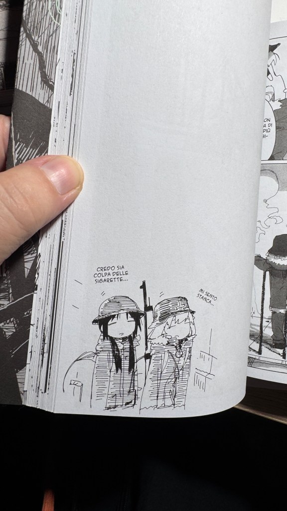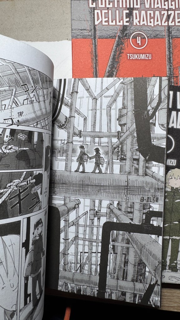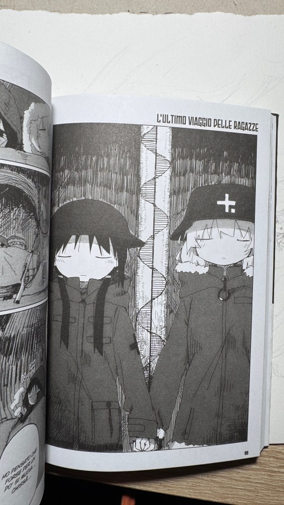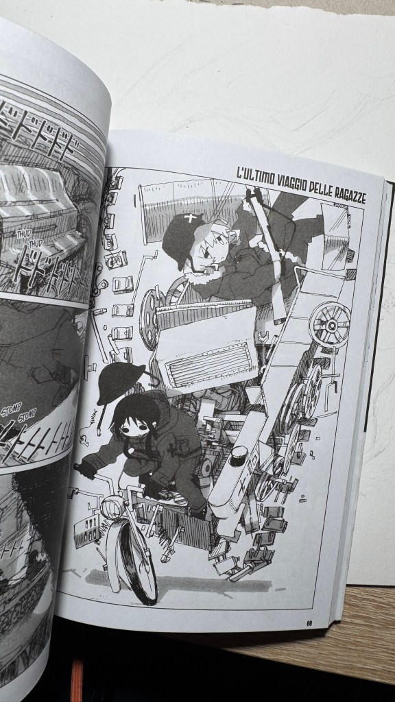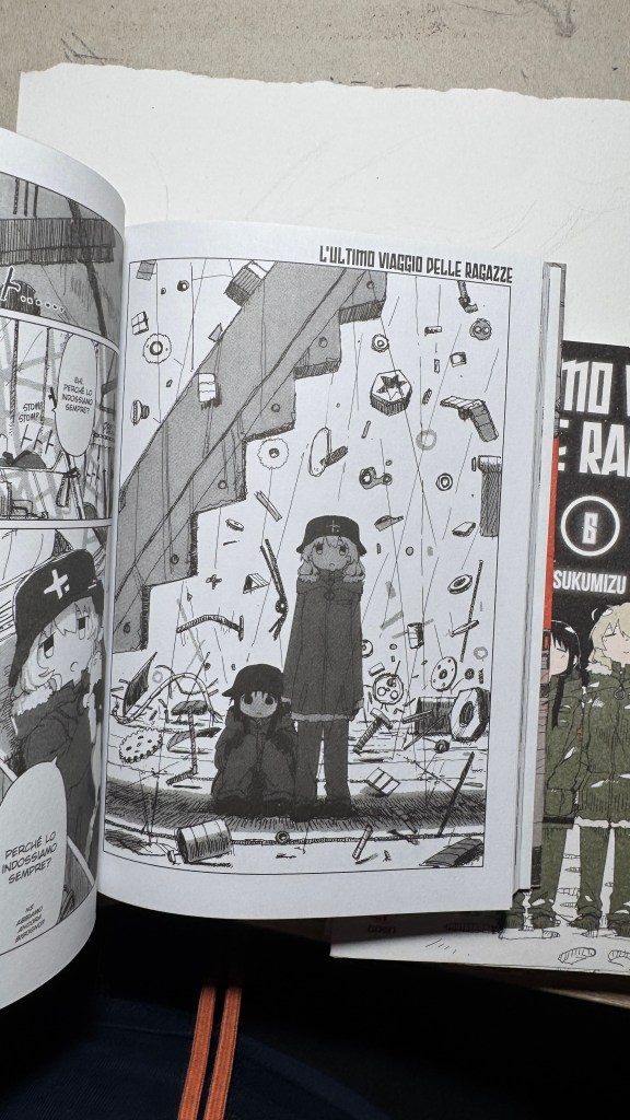 I have been saying for years that original manga and book titles should be written with kanji, not just in rōmaji. Girls’ Last Tour plays on the ambiguity of the pronunciation shūmatsu, which to the ear can mean either “weekend” or “end of the world”. The title in kanji is 少女終末旅行, literally “the girls’ journey to the apocalypse” (shūmatsuron being eschatology), but it could also read as “a weekend outing trip”. And this double meaning is Tsukumizu’s sly trick: Japanese readers enter the manga with dual expectations – is it dystopian or slice‑of‑life? We couldn’t pull off the homophone in Italian, but Tsukumizu, a real fox, uses it masterfully. I won’t say more, this little masterpiece must stay spoiler‑free.