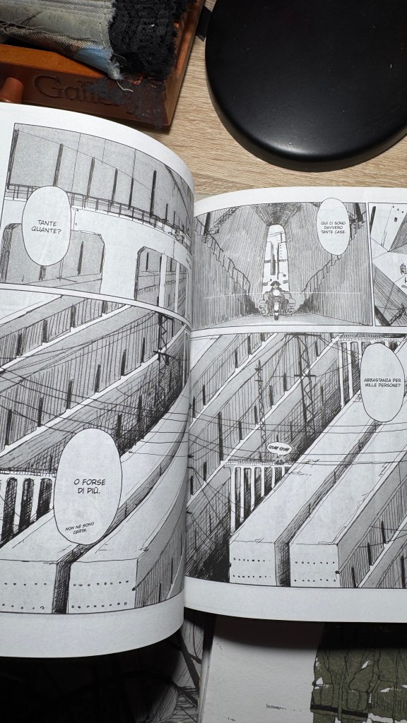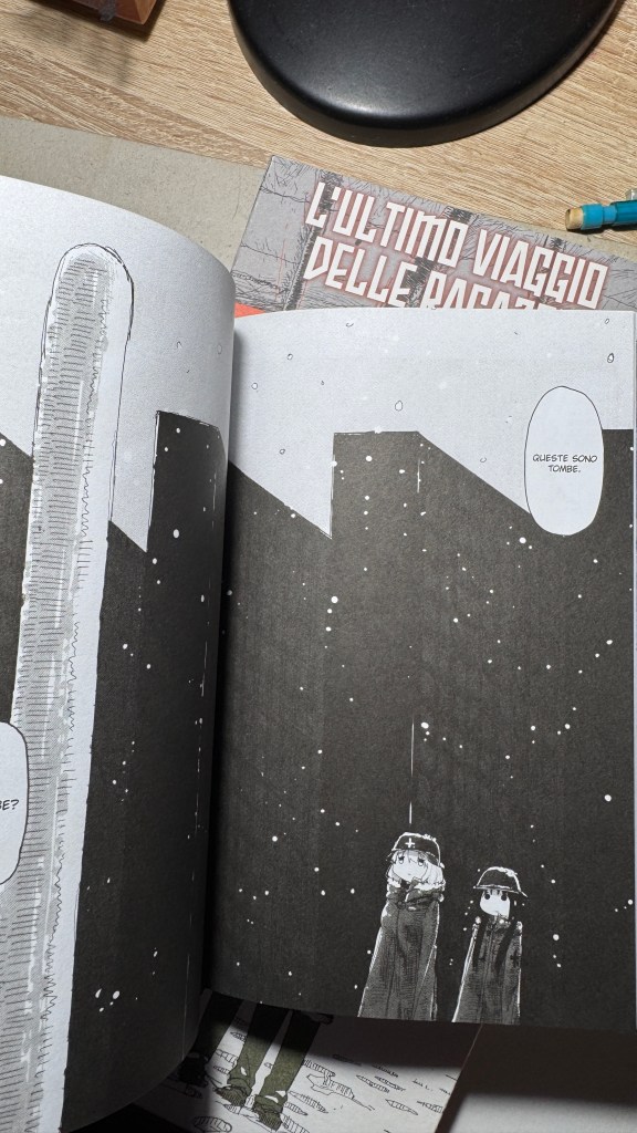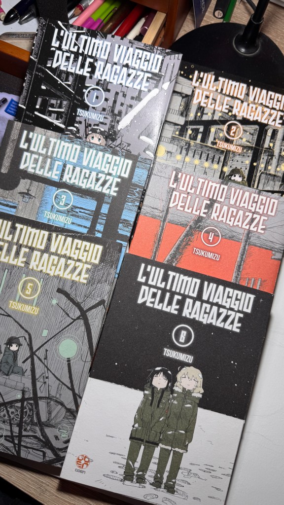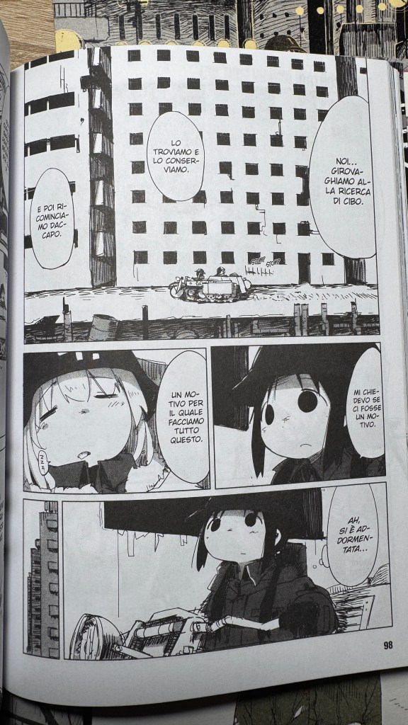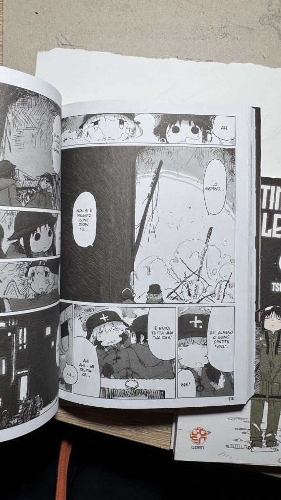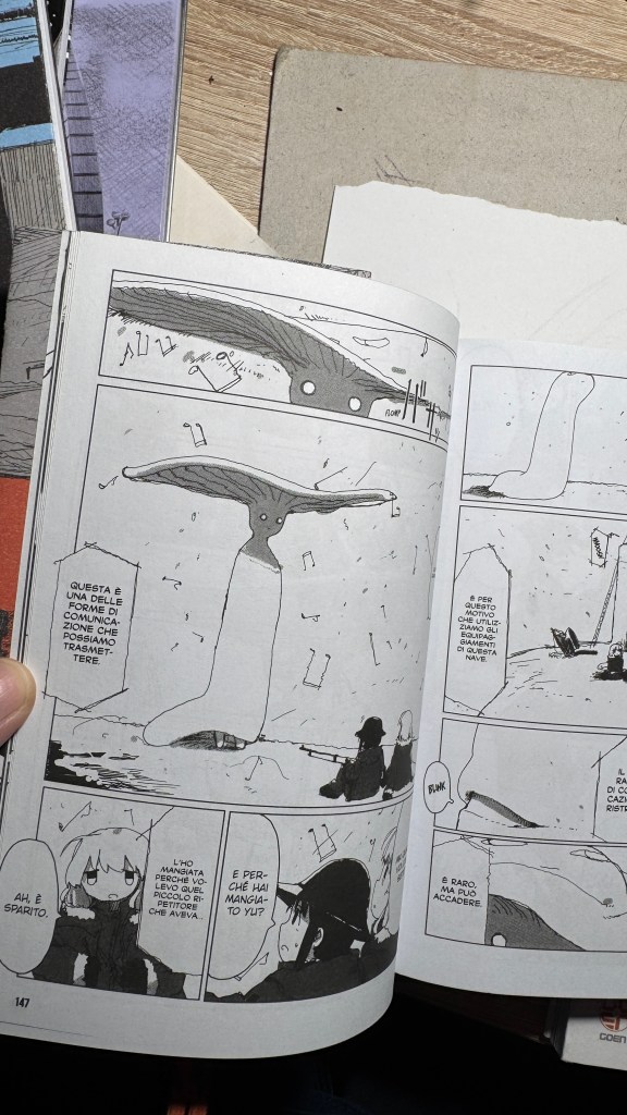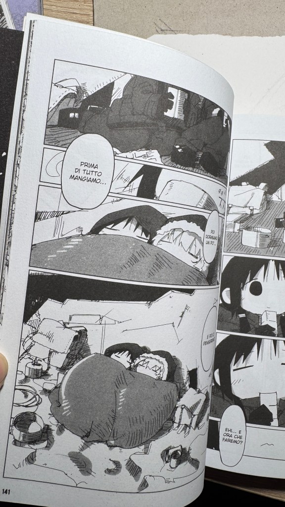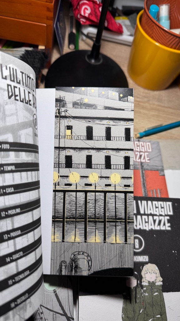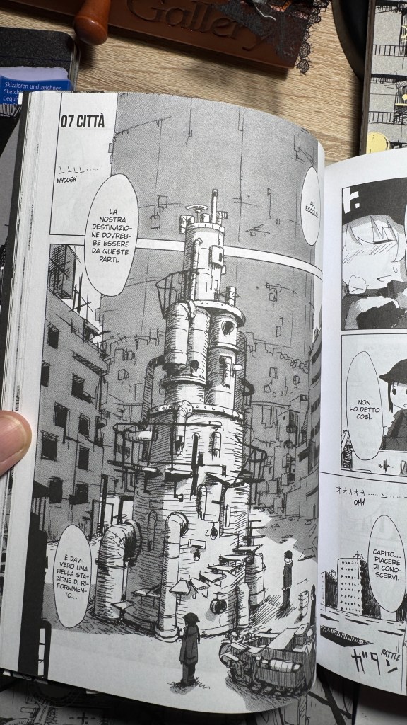I have been saying for years that original manga and book titles should be written with kanji, not just in rōmaji. Girls’ Last Tour plays on the ambiguity of the pronunciation shūmatsu, which to the ear can mean either “weekend” or “end of the world”. The title in kanji is 少女終末旅行, literally “the girls’ journey to the apocalypse” (shūmatsuron being eschatology), but it could also read as “a weekend outing trip”. And this double meaning is Tsukumizu’s sly trick: Japanese readers enter the manga with dual expectations – is it dystopian or slice‑of‑life? We couldn’t pull off the homophone in Italian, but Tsukumizu, a real fox, uses it masterfully. I won’t say more, this little masterpiece must stay spoiler‑free.