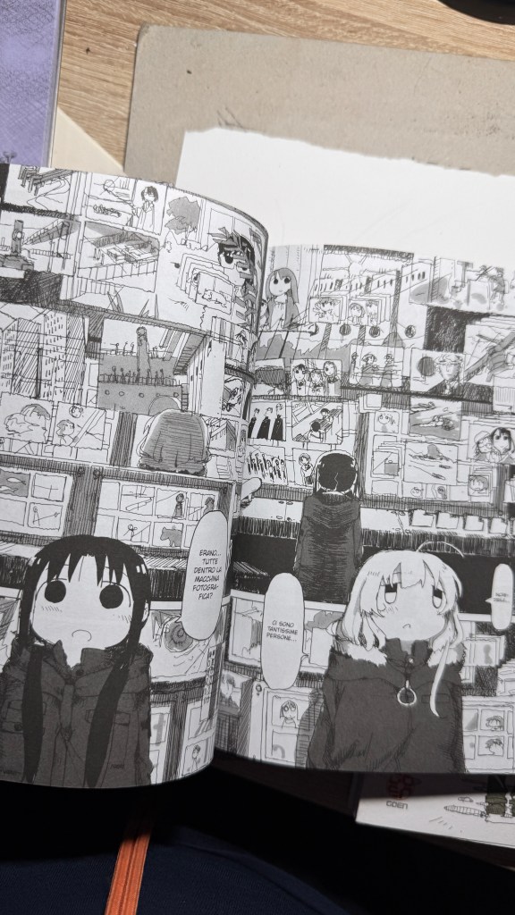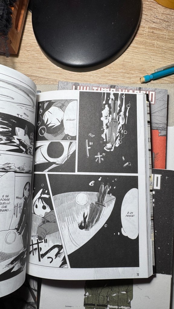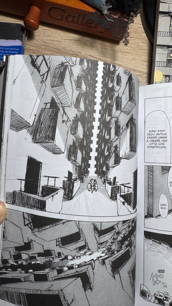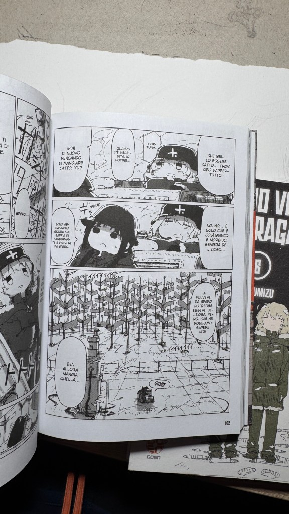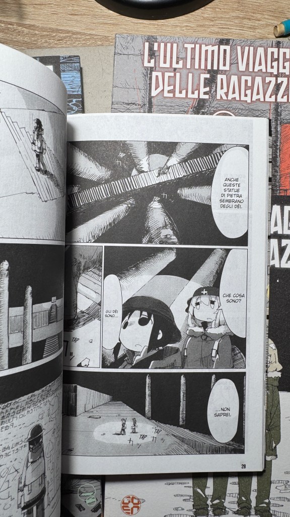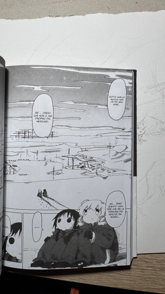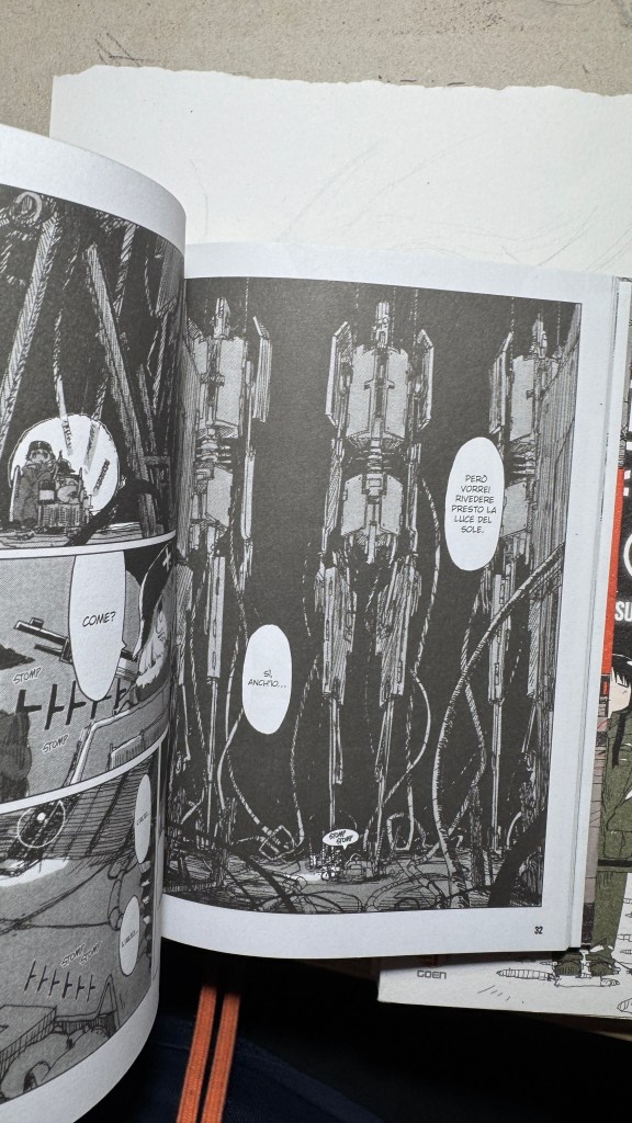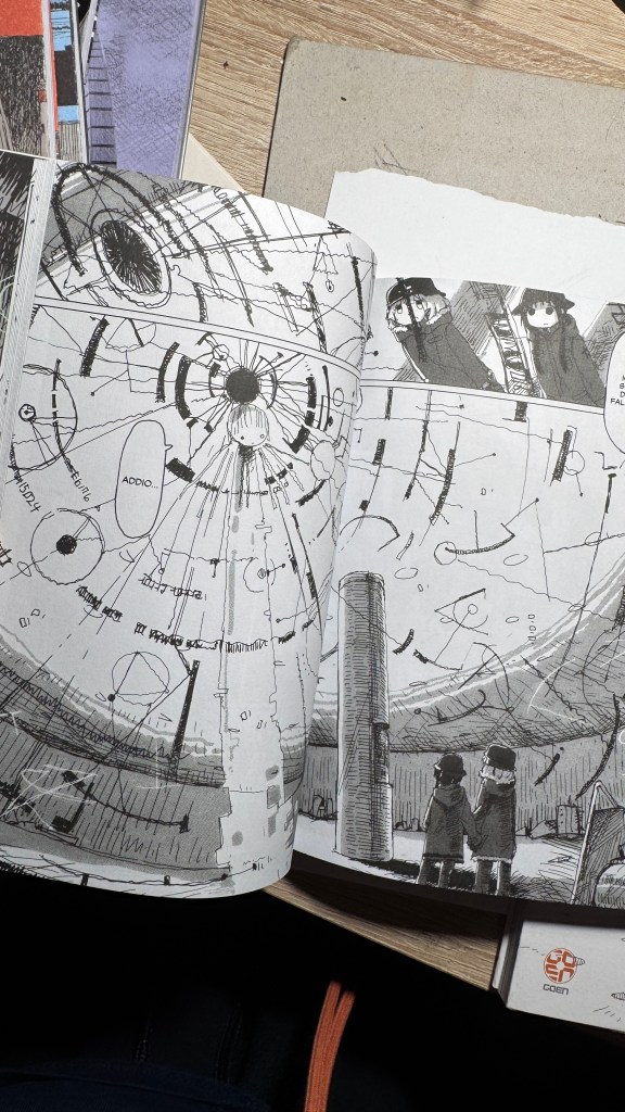 I have been saying for years that original manga and book titles should be written with kanji, not just in rōmaji. Girls’ Last Tour plays on the ambiguity of the pronunciation shūmatsu, which to the ear can mean either “weekend” or “end of the world”. The title in kanji is 少女終末旅行, literally “the girls’ journey to the apocalypse” (shūmatsuron being eschatology), but it could also read as “a weekend outing trip”. And this double meaning is Tsukumizu’s sly trick: Japanese readers enter the manga with dual expectations – is it dystopian or slice‑of‑life? We couldn’t pull off the homophone in Italian, but Tsukumizu, a real fox, uses it masterfully. I won’t say more, this little masterpiece must stay spoiler‑free.