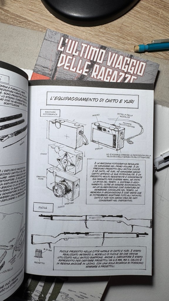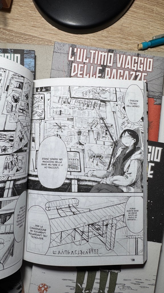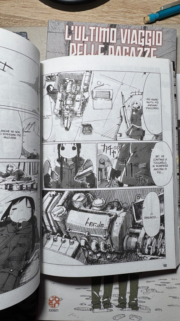 Sono anni che predico che i titoli originali di manga e libri vadano scritti con i kanji e non solo in rōmaji. L’ultimo viaggio delle ragazze gioca infatti sull’ambiguità della pronuncia “shūmatsu”, che all’orecchio può significare “fine settimana” oppure “fine del mondo”. Il titolo in kanji è 少女 終末 旅行, cioè “il viaggio delle ragazze fino all’apocalisse” (shūmatsuron è l’escatologia), ma potrebbe essere anche “la gita fuori porta nel weekend”.