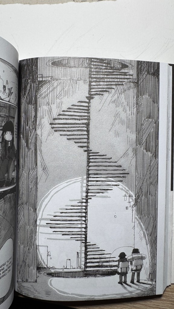 What immediately strikes the eye is the art style: a nervous line from a real g‑pen (Tsukumizu works with Clip Studio Paint), sharp, trembling, with a stark contrast between the almost abstract simplicity of the girls’ faces – formed by near‑circular strokes – and the pileup of background details. The flat graphical representation of the characters strikes a a profound perspective that inevitably evokes Blame! and even Nausicaä.