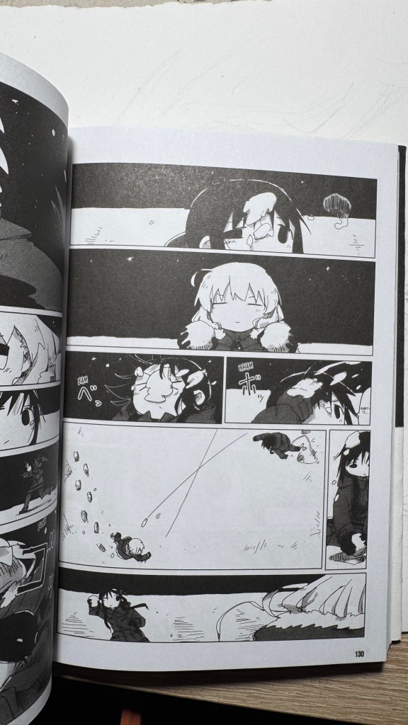 The panels are always linear and very regular, making the story rhythmic and easy to follow but also detached—so the reader doesn’t get swept into the world’s destruction and instead holds onto the warmth of the girls’ innocence. The action is deliberately flattened—never “too much”—to contrast with the setting. This is genius. The destroyed world is narrated and traversed like in a fairy tale. What a fox, Tsukumizu!