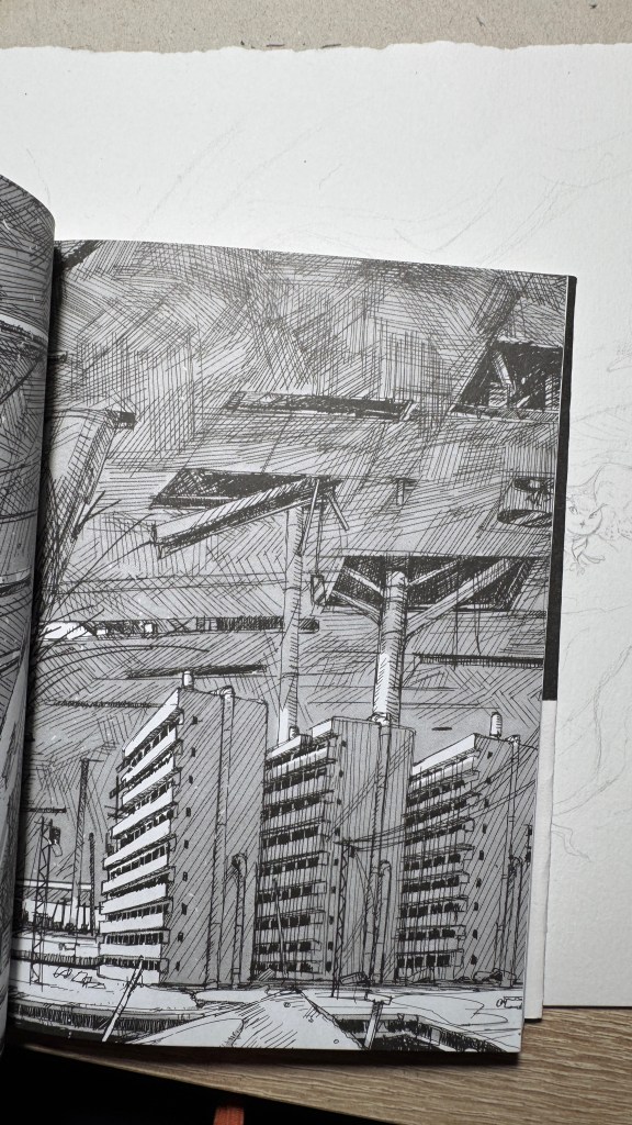 まず目を引くのはそのグラフィックスタイルです。実際のgペンのような緊張感ある線(つくみずはClip Studio Paint使用)、鋭く震えるようなタッチ、少女たちの顔はほぼ円形の記号で描かれた抽象的な構成、一方で背景には膨大なディテールがびっしり詰め込まれています。キャラクターの平面的表現と深遠な遠近法の背景との対比は、必然的に『BLAME!』や『風の谷のナウシカ』を想起させます。