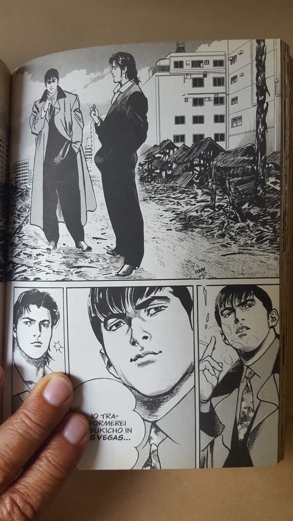 Lo sfondo del quartiere è decisamente uno dei protagonisti. I paesaggi urbani sono una delle qualità più irresistibili del manga, che qui si appoggia a degli scatti di Ito Masazo e dello stesso Ikegami. Kabukicho viene spesso ritratto di notte, quando le luci sono accese, i neon lampeggiano e le insegne creano dei grafismi pop e postmodern. Ikegami riesce a ottenere una grande profondità di campo attraverso l’uso combinato del retino e del tratteggio. Alleggerendo sia l’uno che l’altro, e soprattutto “aprendo” il tratteggio (cioè distanziando i singoli tratti di penna), le luci distanti diventano evanescenti e il paesaggio urbano morbido ma non confuso, con le tipiche sfocature delle fotografie notturne dei quartieri ricchi di insegne e neon.