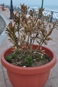 Questo è lo stato degli oleandri piantati in bellissimi vasi di plastica finto-coccio e disposti a distanza regolare sul lungomare, ancora più vicino ai venti salsi del mare: Come volevasi dimostrare Vento in faccia e salsedine: ottimo per i brufoli, un po' meno gradito dagli oleandri I morticini in fila. Poi li butteranno e li ripianteranno. Tu muori?E io ti riammazzo!