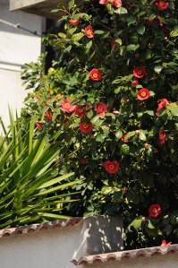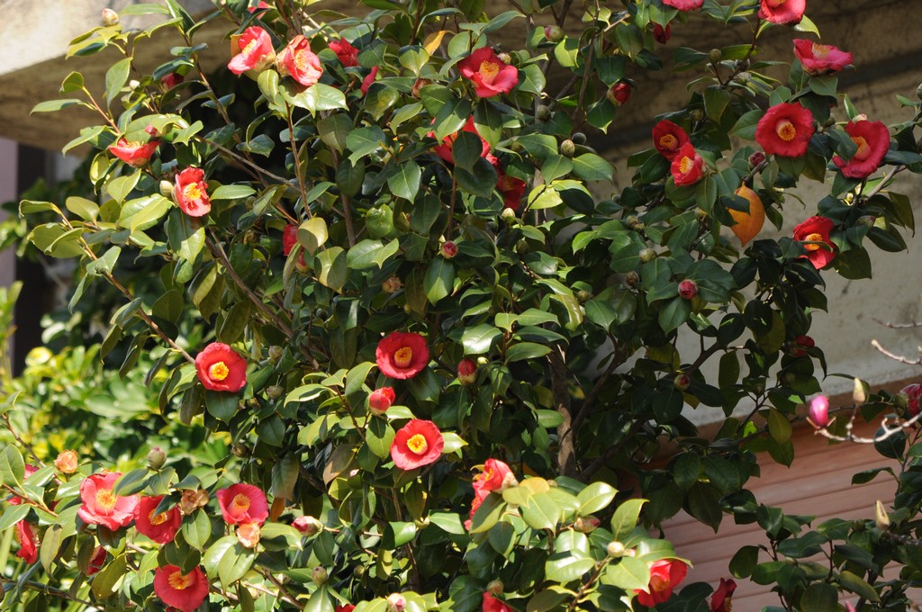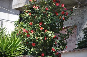 Una fantastica camelia rossa a fiore semplice, del tipo più diffuso nelle nostre zone, in una fascia di cortile davanti ad una casa anonima. Che direbbe un cinese?