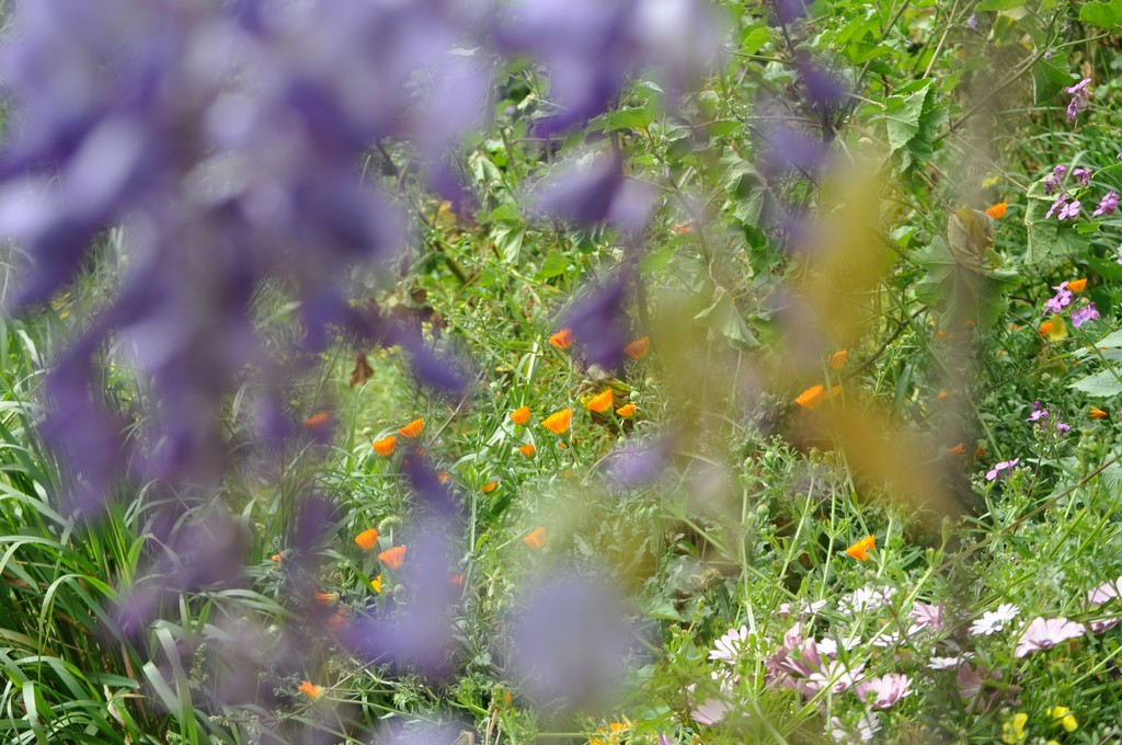 Mi piace la zona sotto il glicine, è molto scomposta, ci sono calendule, lunarie abrotano, e un sacco di erbacce. Lì sono seppelliti i miei adorati animali.