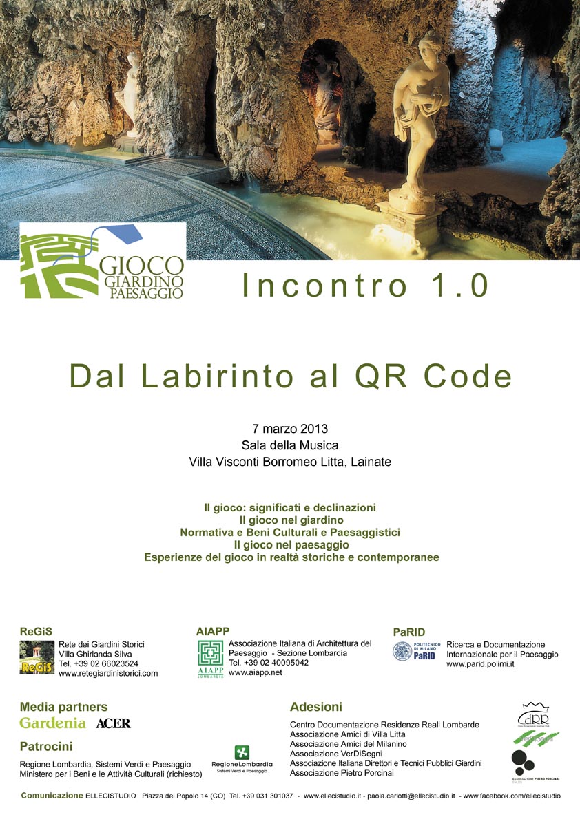 1.0 “GIOCO GIARDINO PAESAGGIO. Dal labirinto al QR Code” Salone delle Feste, Villa Visconti Borromeo Litta, Lainate – Milano – 7 marzo 2013