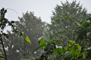 thunbergia sotto la pioggia Qui si è mangiata un vecchio Hibiscus, si sta mangiando un arancio, e se ne sta andando su degli avocados, e anche noi la tagliamo (di tanto in tanto).