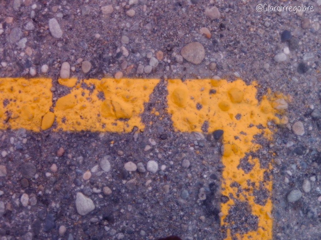Linee di mezzeria assenti, o storte. Chi ha passato la vernice ha tenuto sollevato un lato della dima e il segno si è allargato, gonfiandosi in una curva leggera e morbida, che ricorda i vecchi effetti fatti con l’aerografo. È sbagliata, ma bella.