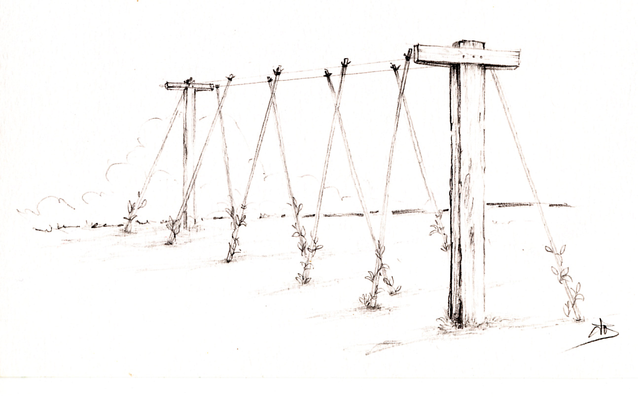 Costruite due pali a forma di “T” , alti un paio di metri, e distanziateli a seconda del numero delle piante che avete, considerando che queste andranno a 20 cm. l’una dall’altra. Poi tendete dei robusti fili (quelli per stendere i panni vanno bene) alle estremità dei listelli orizzontali, e sistemate le canne di sostegno, legandole ai fili. Abbiate cura che le canne siano un po’ svasate verso il basso.