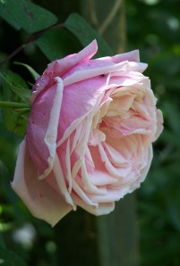 Seconda virtù: la bellezza del fiore. Si tratta di una delle tante figlie di ‘New Dawn’, ottenute incrociandola con rose Ibride di Tè, e con cui condivide molte caratteristiche. Il colore rosa argentato del fiore, ad esempio, è tipico di ‘New Dawn’. Il fiore è grande, pienissimo, con la tipica forma degli ibridi tra rose antiche e moderne: parte da un bocciolo allungato e raffinato, e si apre in una corolla molto ricca, con petali che si curvano all’indietro formando delle punte. Inoltre il rovescio del petalo ha un colore più scuro, caratteristica tipica di alcuni rosai cinesi, come ‘Alice Hoffmann’ ed ‘Hermosa’, che dà al fiore una morbidezza quasi commestibile, e fa venire voglia di ingoiarlo.