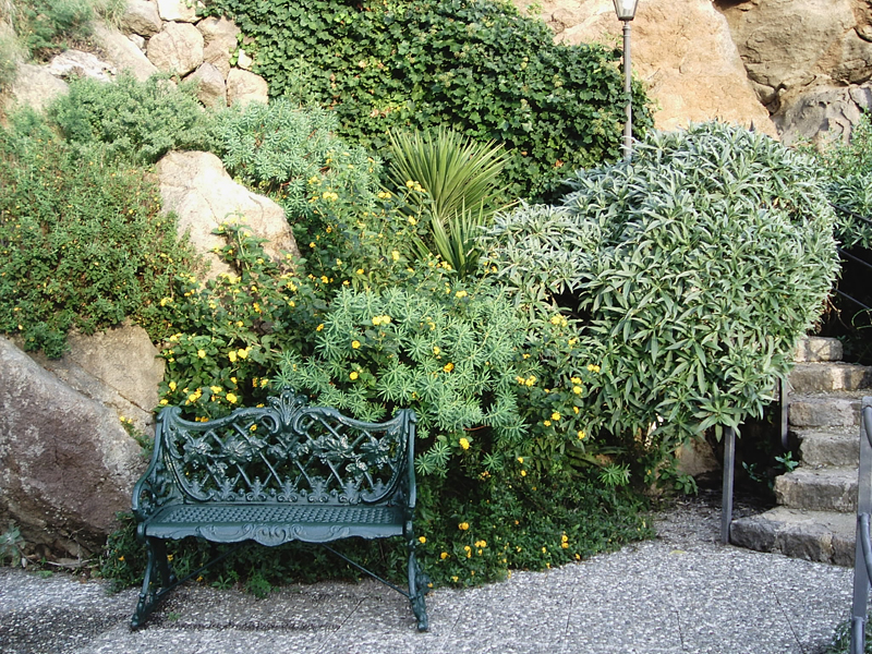 I giardinieri mediterranei quindi pensarono a tutte le essenze endemiche del bacino, soprattutto a quelle che vivono nei pendii assolati e battuti da venti salsi, cioè le piante della macchia mediterranea e della gariga, come euforbie, lavande, cisti, corbezzoli, lentischi, agnocasti. Spesso a queste piante autoctone venivano associate delle cactacee, come le agavi.